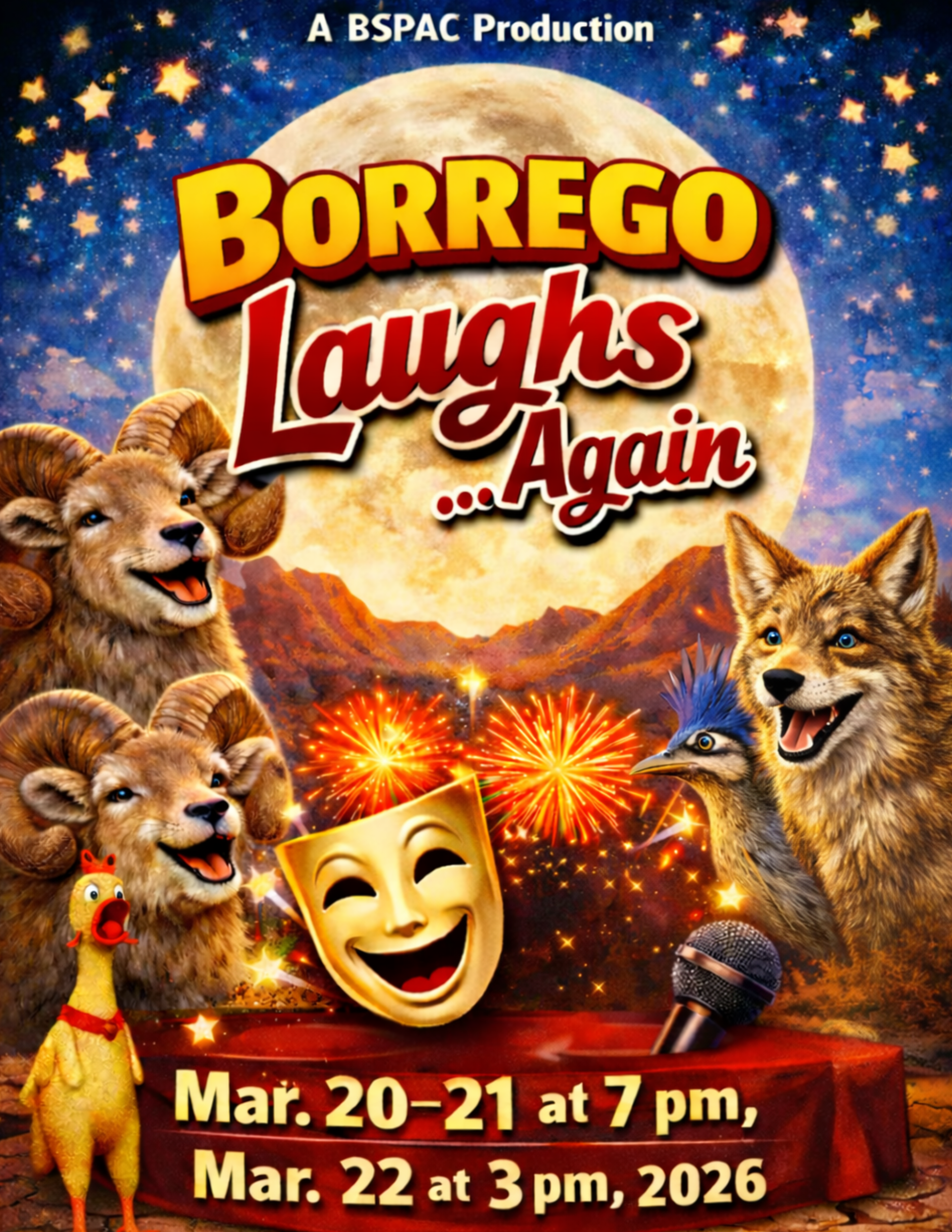Local comedy returns to BSPAC Borrego Laughs Again returns to the Borrego Springs Performing Arts Center for three performances on March 20 and 21 at 7 p.m. and March 22 at 3 p.m., 2026. This BSPAC production features local talent, making it a fun chance to see Borrego Springs performers on stage. Events like this are part of what keeps live entertainment active in Borrego Springs and gives the community something special to support. Tickets are expected to go quickly, so it is a good idea to buy early at bspac.org. Learn More About Borrego Springs