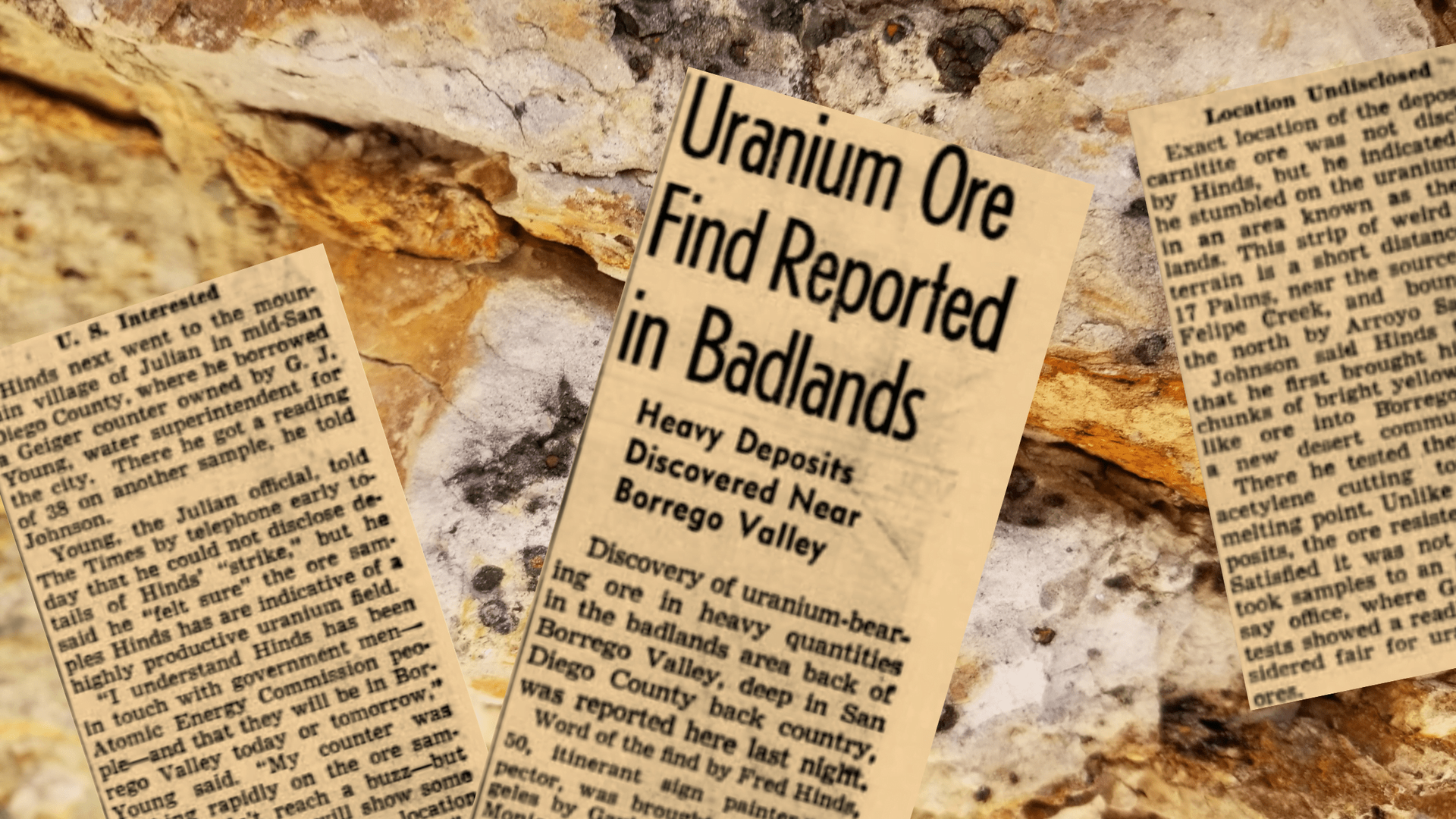 Discovery of uranium-bearing ore in heavy quantities in the badlands area back of Borrego Valley, deep in San Diego County backcountry, was reported here last night. Word of the find by Fred Hinds, 50, itinerant sign painter-prospector, was brought to Los Angeles by Gaylord Johnson, Santa Monica commercial photographer, who was at Borrego Springs when Hinds made his discovery.