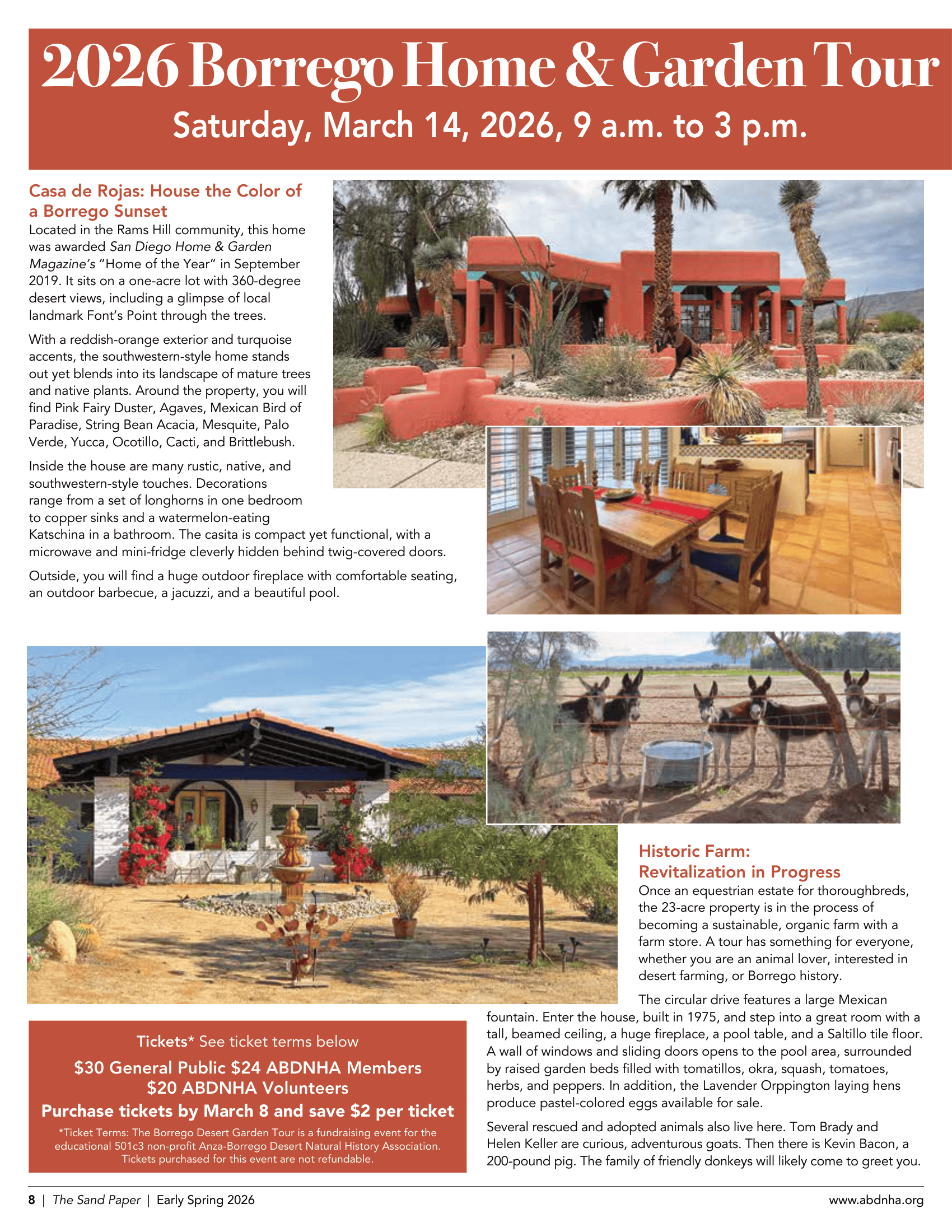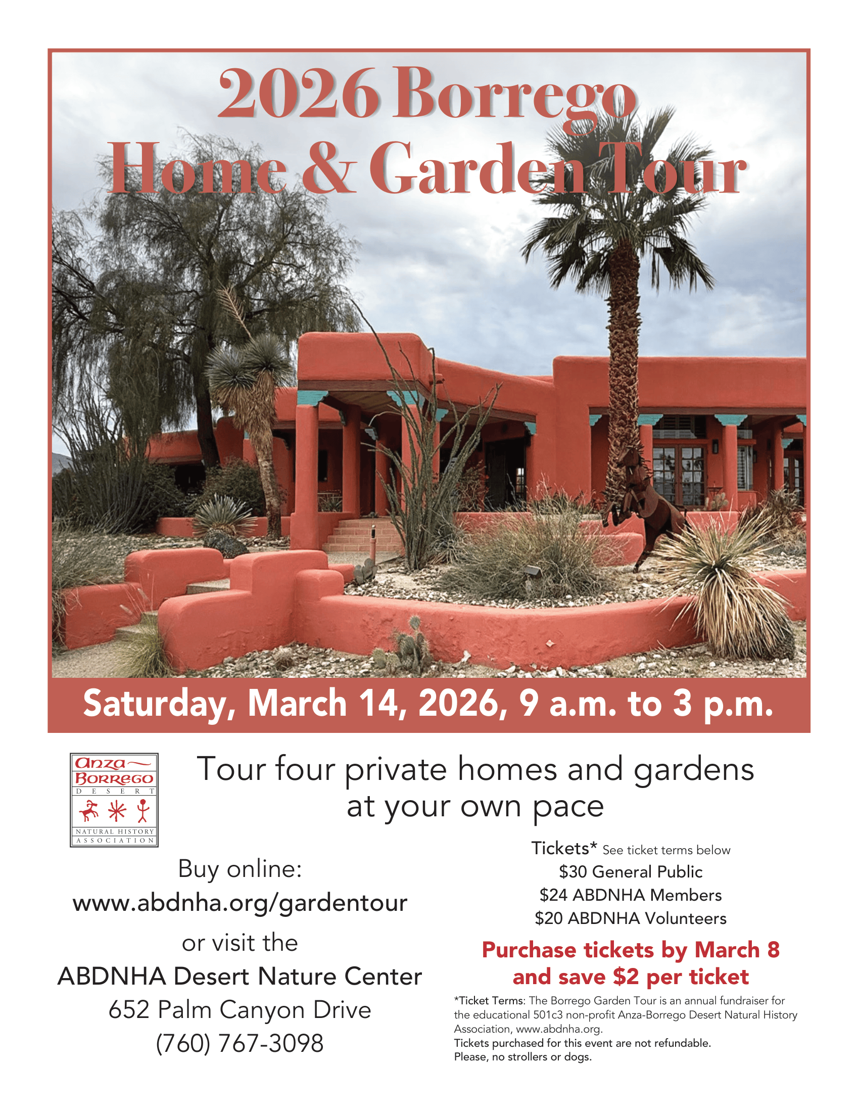 Borrego Springs, CA The Anza-Borrego Desert Natural History Association (ABDNHA) will host the 2026 Borrego Home & Garden Tour on Saturday, March 14, 2026, from 9:00 a.m. to 3:00 p.m. The public is invited to explore four private homes and gardens at their own pace in Borrego Springs.