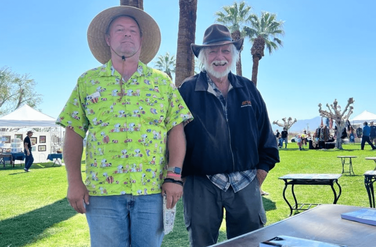 Under the cool shade of a towering palm tree, I found my good friend Denny Duvall. His table was set up with a perfect view of the stage and all the festival-goers and their furry friends passing by. Meeting Denny, a long-time resident of Borrego Springs, was one of the highlights of my time at the festival. He was selling his first published book, “That’s My Story and I’m Stickin’ To It,” a delightful collection of whimsical short stories about life in Borrego Springs.