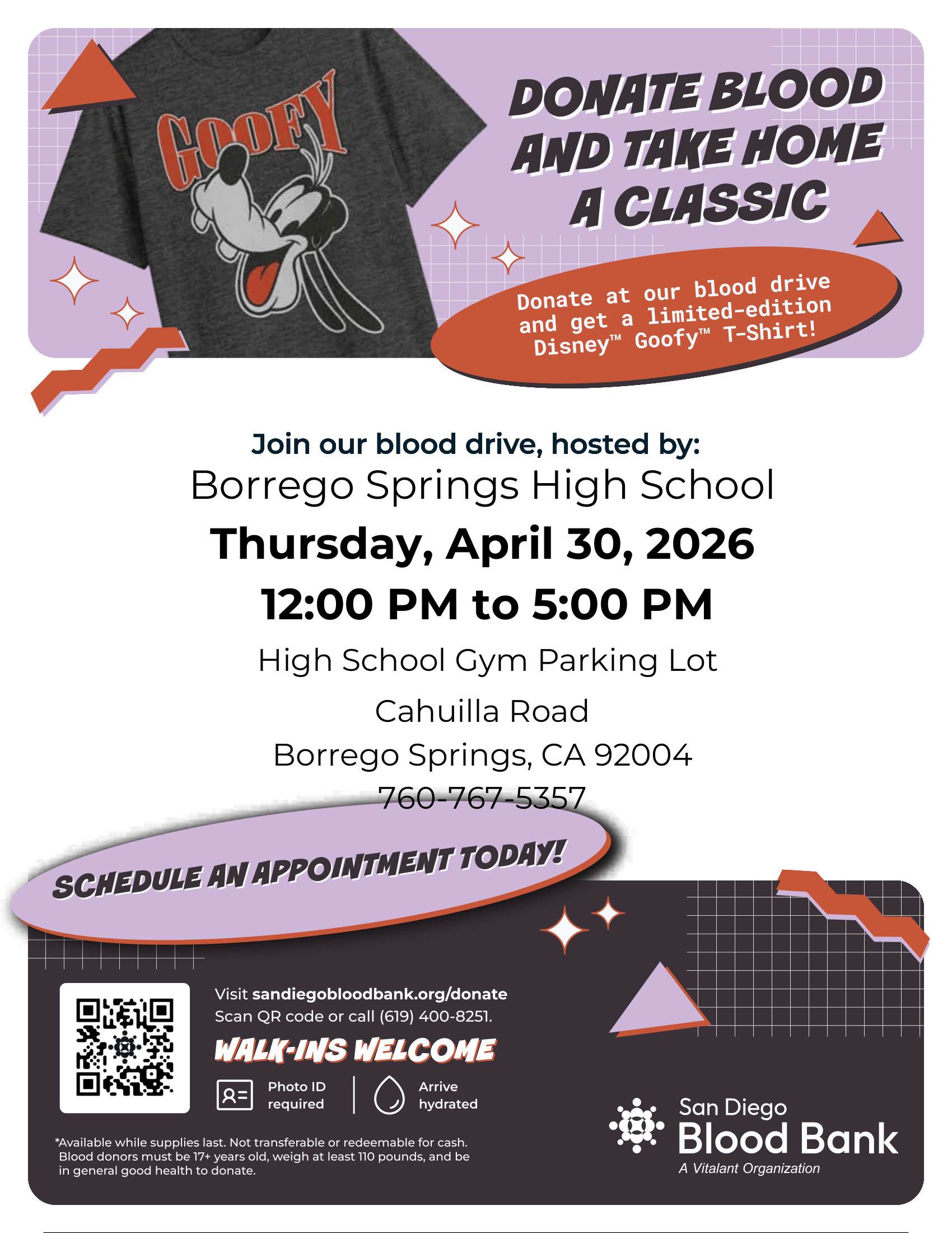 A community blood drive is scheduled at Borrego Springs High School on Thursday, April 30, 2026. Hosted in partnership with the San Diego Blood Bank, the event offers residents an opportunity to donate locally and support regional medical needs.
