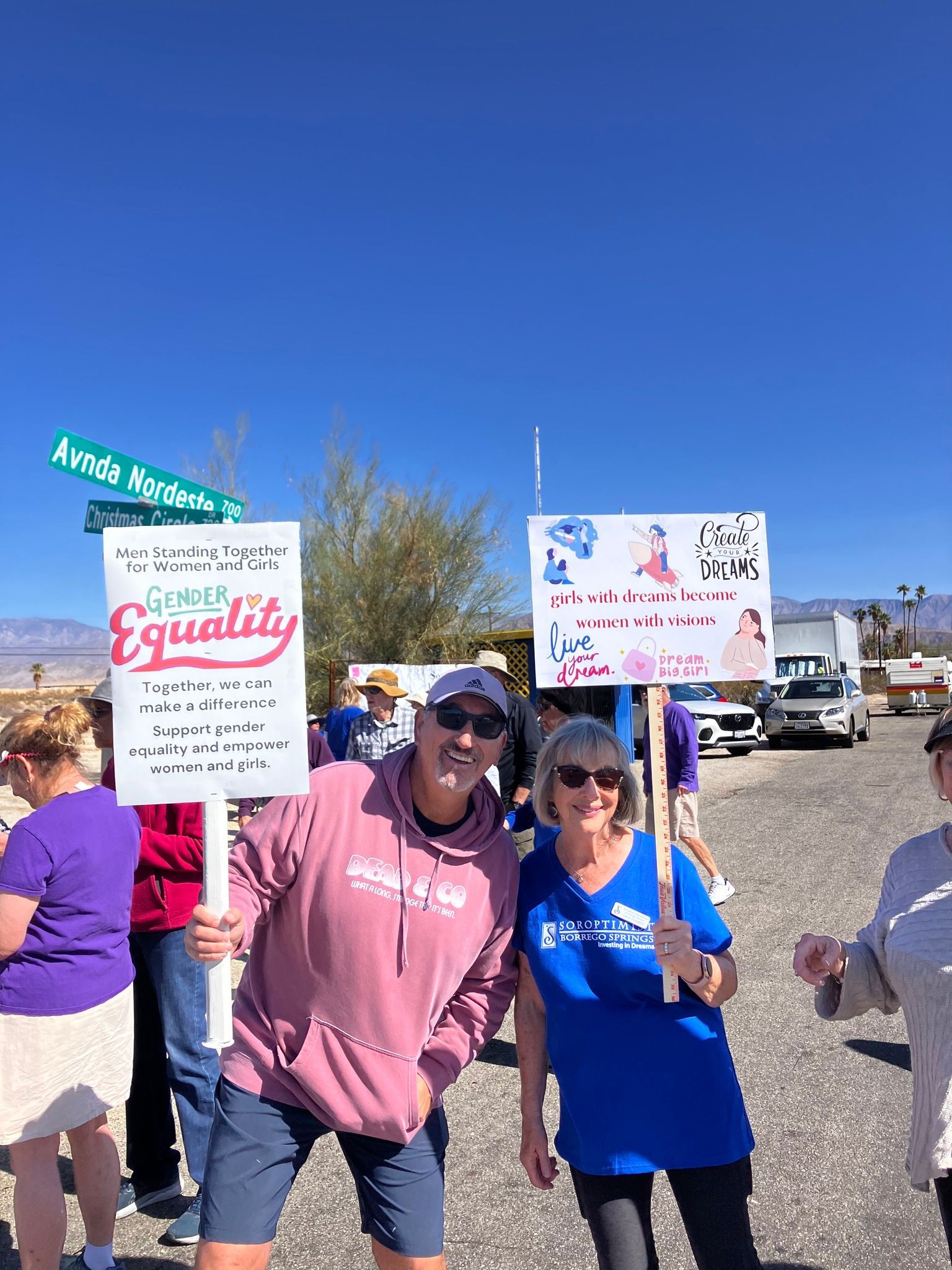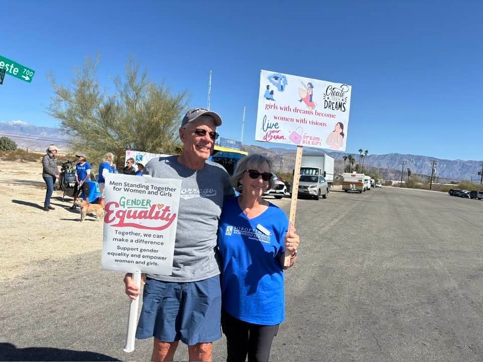 On March 8, International Women’s Day, Soroptimist International of Borrego Springs gathered across from Christmas Circle to walk in support of women’s rights and equality. Community members, both women and men, joined the walk to show their commitment to empowering women and girls.