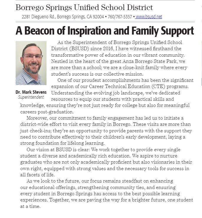 The overall aim of the district, as stated by Dr. Stevens, is to offer a well-rounded education that equips students with the academic skills and values necessary for success. The message also looks forward to the district's continuous commitment to improving educational offerings and maintaining strong ties within the Borrego Springs community.