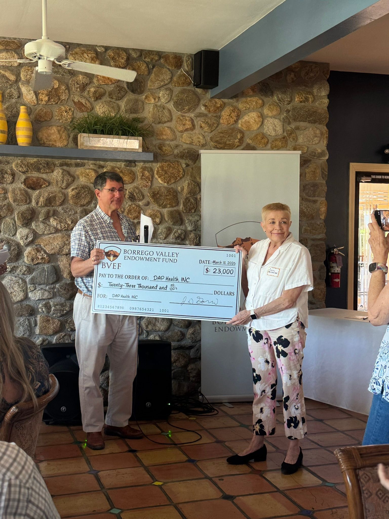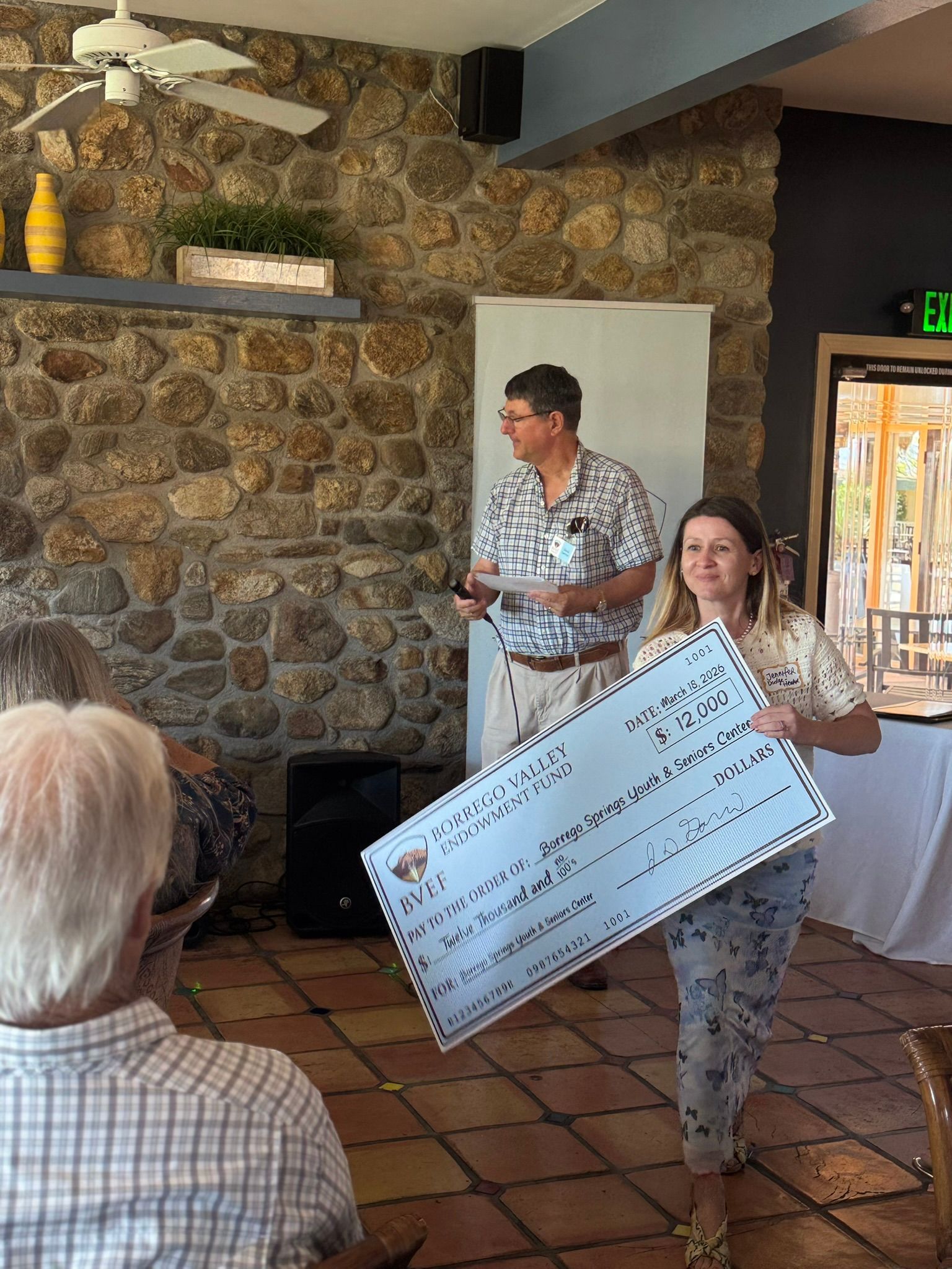 The speakers during the presentation were Anna Abatzoglou, Executive Director of the Borrego Valley Endowment Fund, and David Garmon, president of the BVEF board.