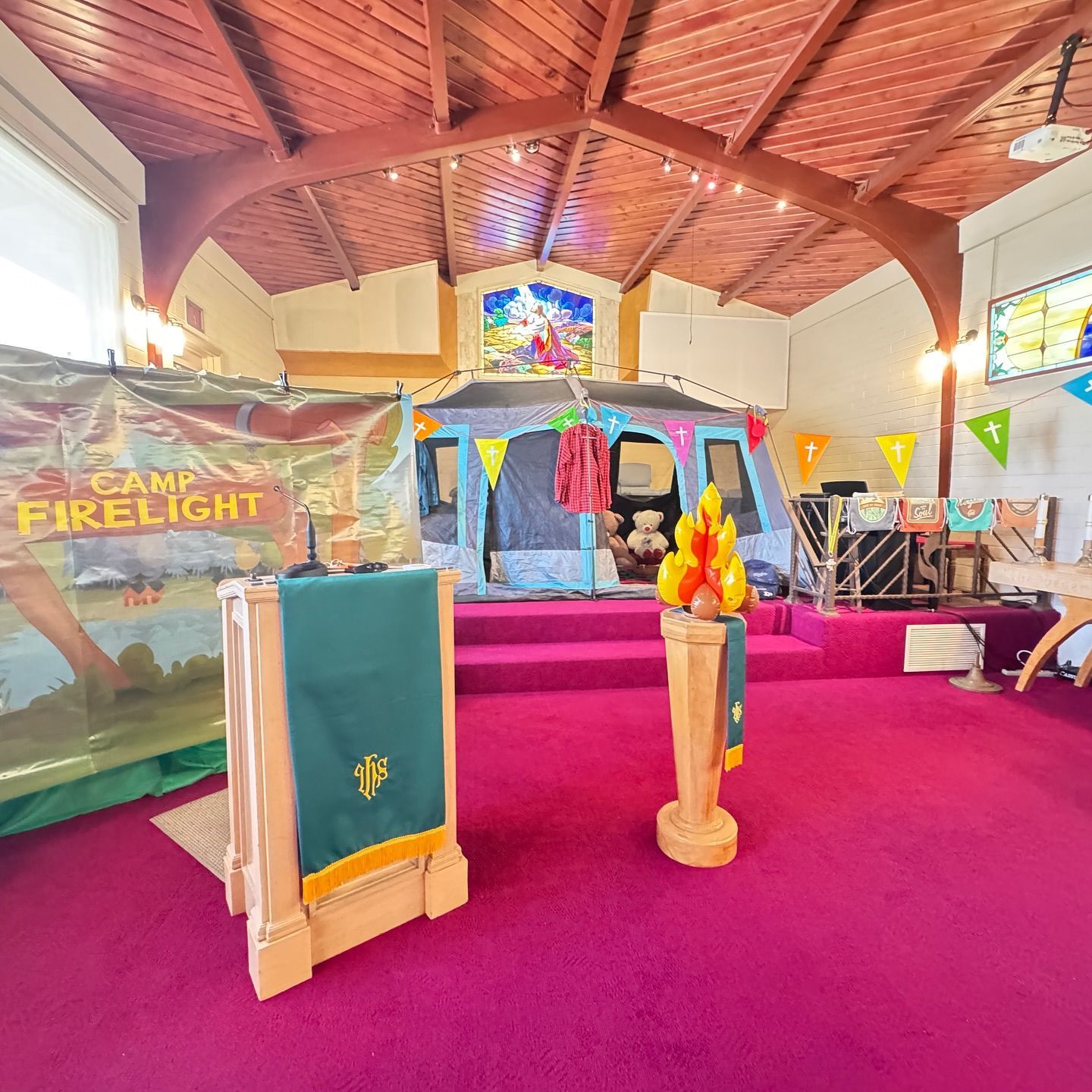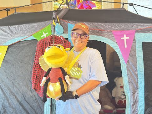 Each day ran from 10:00 AM to 2:00 PM at 633 Church Lane, with lunch and snacks provided. Campers rotated through a schedule that included Bible storytelling, sign language, science experiments, and hands-on crafts. The sanctuary was transformed into a colorful indoor “camp” with a large tent, themed decorations, and a symbolic campfire. Leaders Mrs. Rue and Lumi the Lightbug helped bring the curriculum to life.