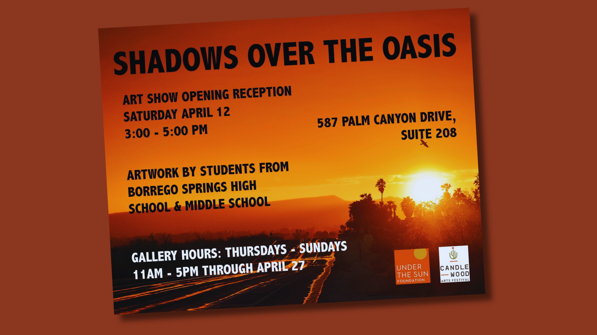 The Candlewood Art Exhibition, titled Shadows Over the Oasis, opens this Saturday, April 12, from 3:00 PM to 5:00 PM in Suite 208 at The Mall, located at 587 Palm Canyon Drive.