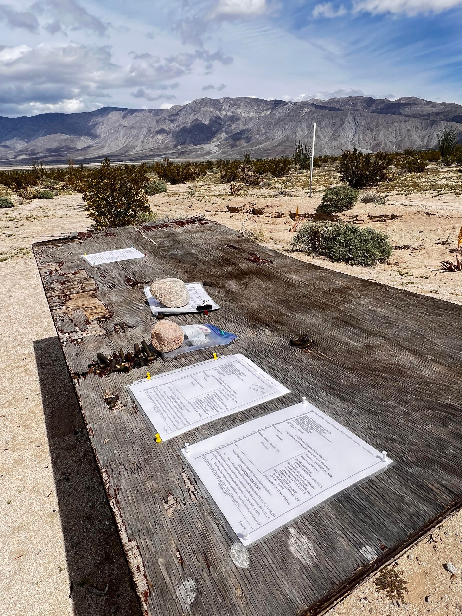 We came across a table in the Drone Zone Sanctuary, where legal documents were meticulously placed, each protected from the desert elements in clear plastic covers, held securely by tacks and stones against the persistent wind.