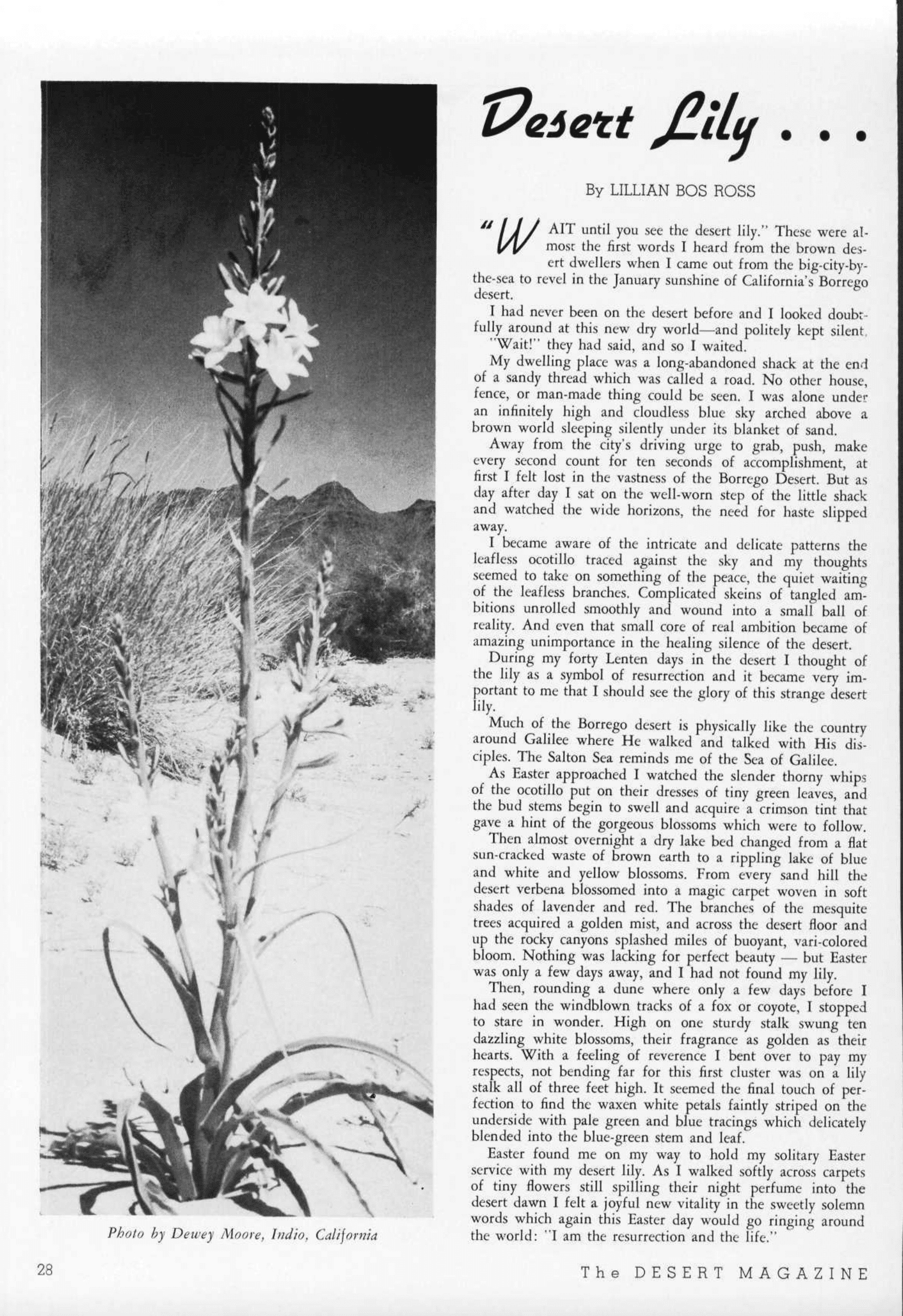 “Wait Until You See the Desert Lily” These were almost the first words I heard from the brown desert dwellers when I came out from the big-city-by-the-sea to revel in the January sunshine of California’s Borrego desert. I had never been on the desert before and I looked doubtfully around at this new dry world—and politely kept silent “Wait!” they had said, and so I waited.