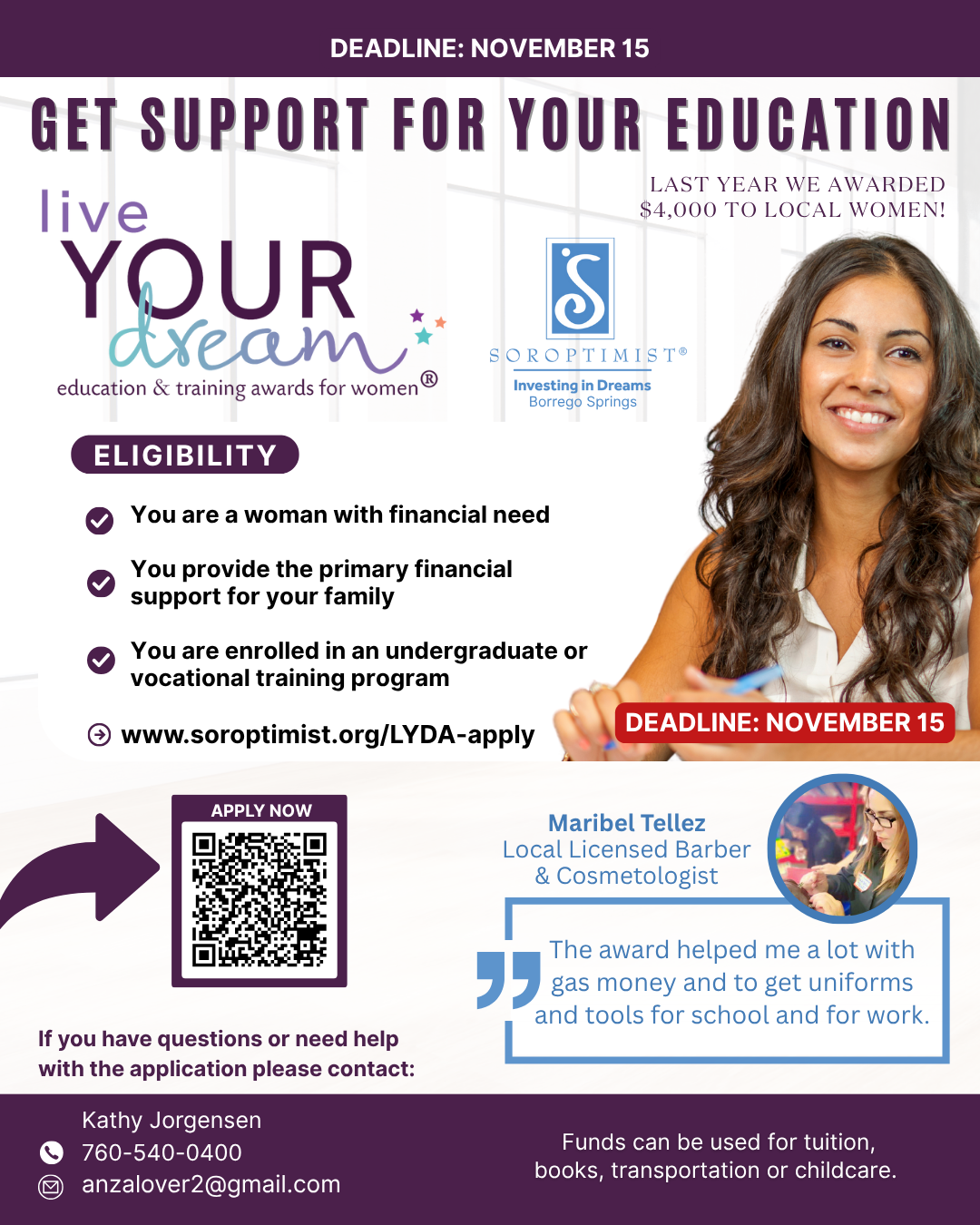 If you’re a woman living in Borrego Springs, Warner Springs, Salton City, Ocotillo Wells, or Julian, and you are working to improve your life through education, the Soroptimist Live Your Dream Award is here to support you. This grant offers $1,000–$4,000 in financial assistance to help cover education-related expenses.