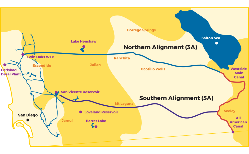 - The third, and northernmost, route would proceed alongside the Westside Main Canal toward the Salton Sea, pass by Borrego Springs, and traverse through the mountains. This route would connect to the Water Authority’s Twin Oaks Valley Water Treatment Plant in San Marcos.