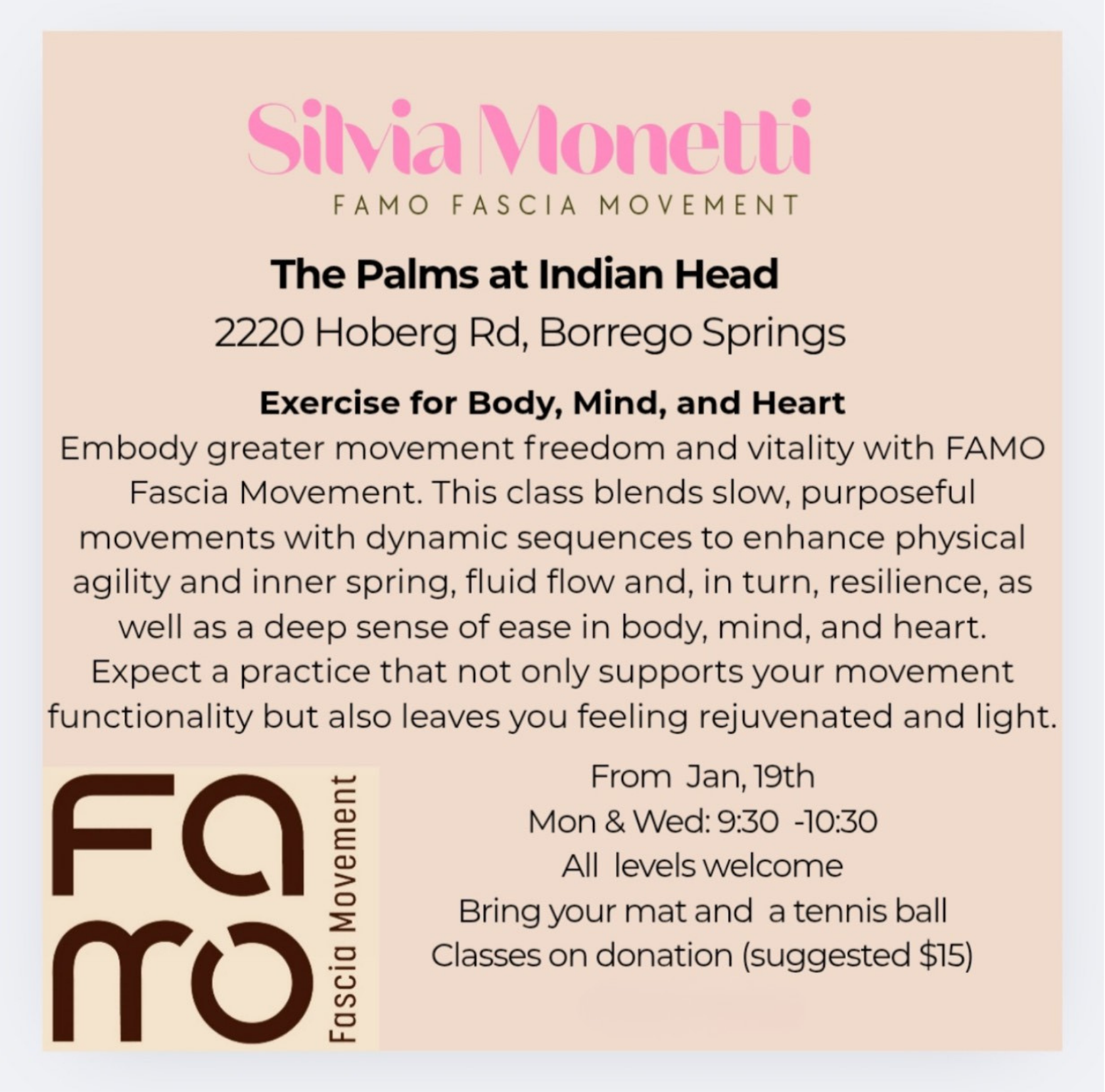 FAMO Fascia Movement classes led by Silvia Monetti are offered at The Palms at Indian Head in Borrego Springs. These donation-based classes focus on purposeful movement designed to support mobility, coordination, and overall physical well-being. Open to all levels, the classes provide a structured yet accessible approach to movement in a calm indoor setting.