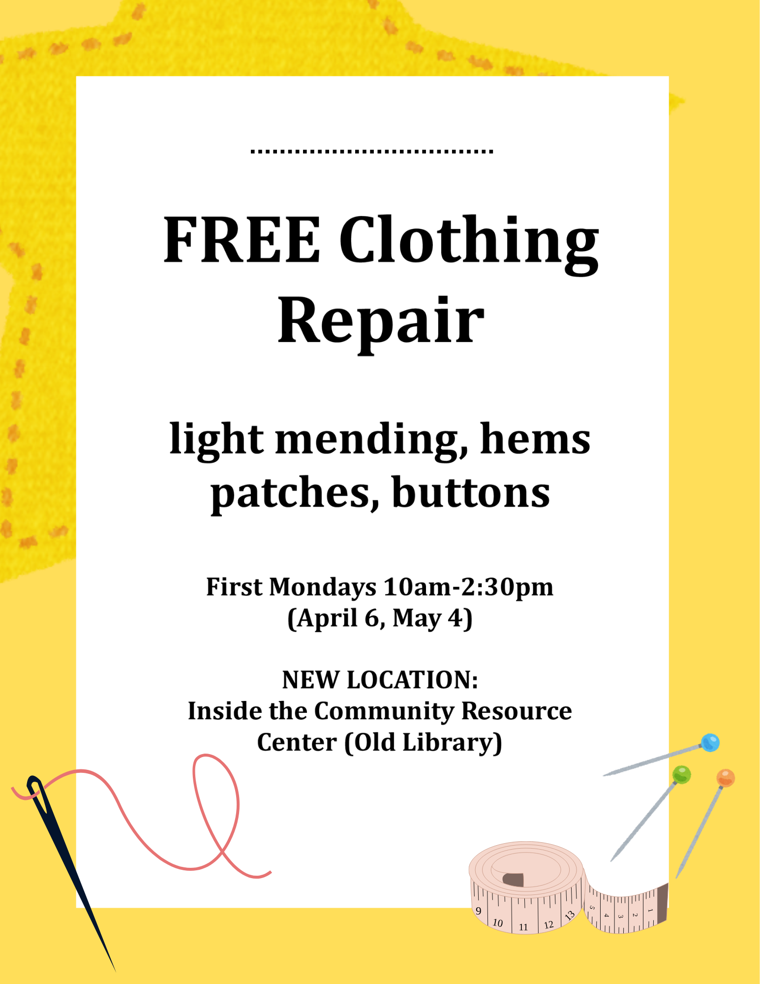 Every first Monday of the month, light repair services such as mending, patches, buttons, and hems are offered at the Borrego Springs Community Resource Center, 587 Palm Canyon Dr #125, Borrego Springs, CA 92004.
