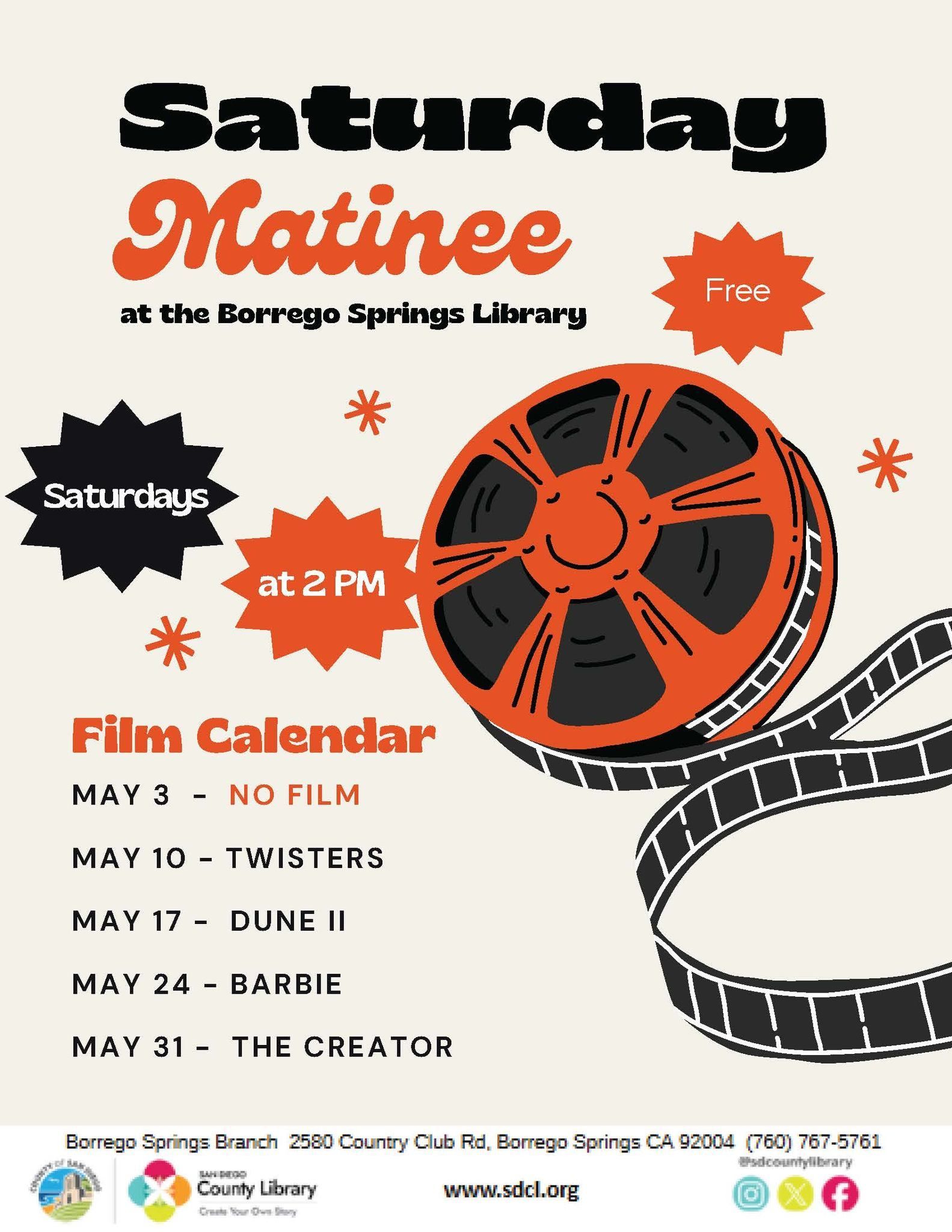 Enjoy a free afternoon movie at the Borrego Springs Library every Saturday at 2 PM. The Saturday Matinee series offers a fun lineup of films for the community — a great way to cool off and relax.
