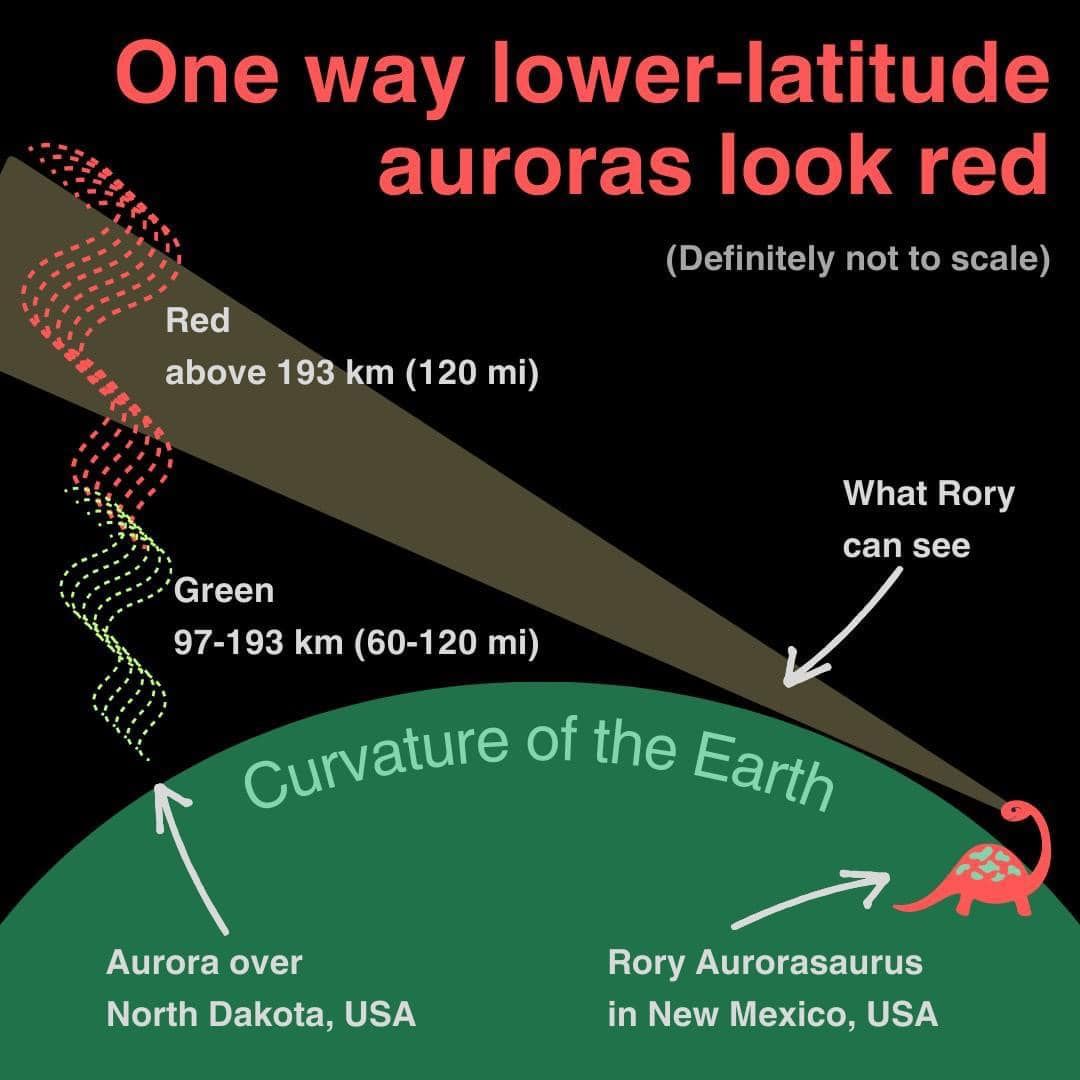 "These two graphics illustrate why we see mostly red (and sometimes blue/purple) from low latitudes, while at higher latitudes we see green, red and other colors. Thanks to aurorasaurus.org and space.com." ~ Astronomer Dennis Mammana