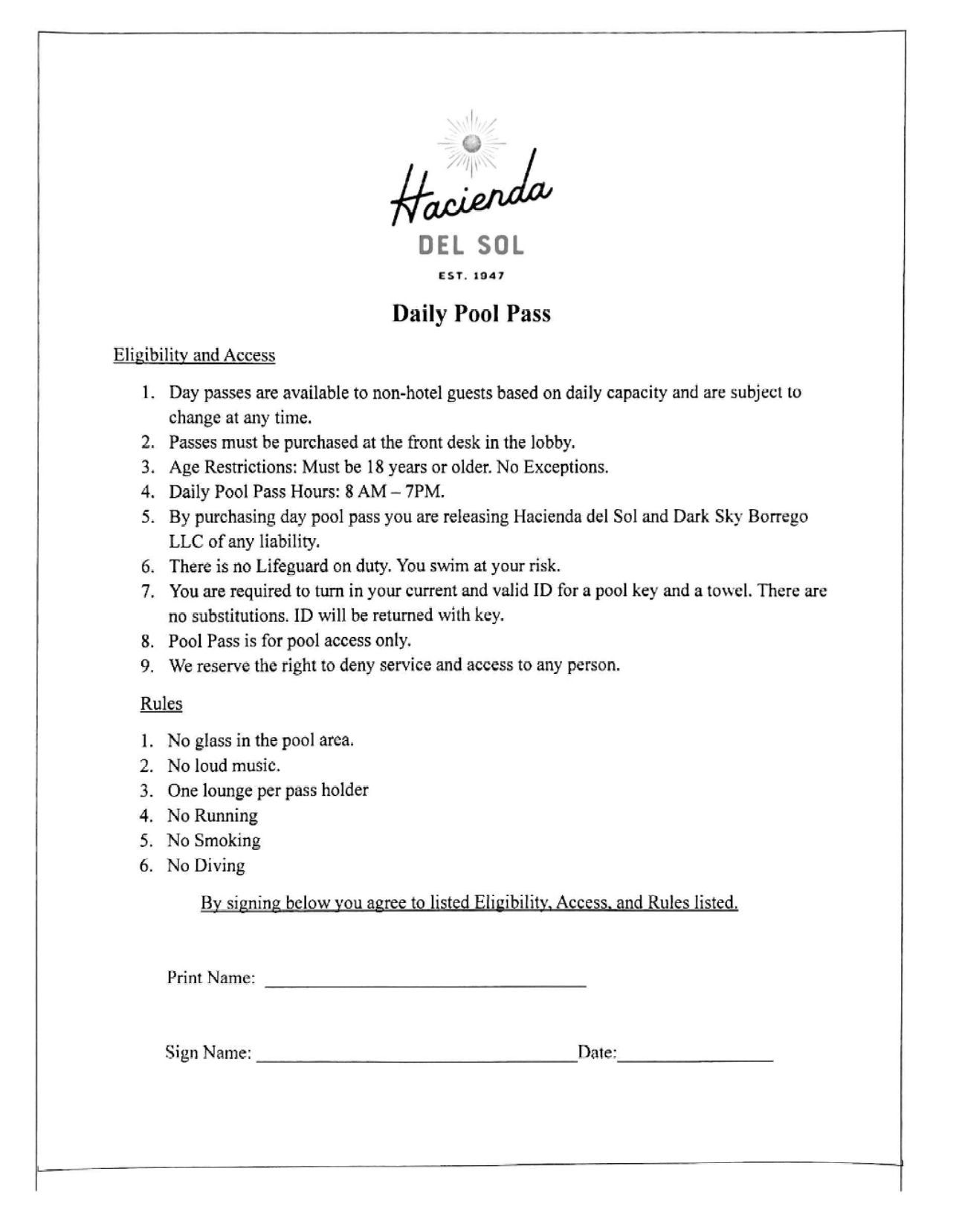 Guests are required to sign a daily pool pass form agreeing to the posted rules. One lounge per pass holder. No lifeguard on duty.