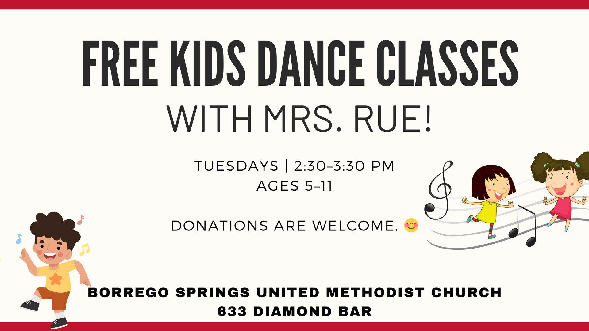 Every Tuesday afternoon, laughter and music fill the room at Borrego Springs United Methodist Church. That’s when Mrs. Rue brings her signature energy, creativity, and heart to a free dance class just for kids.