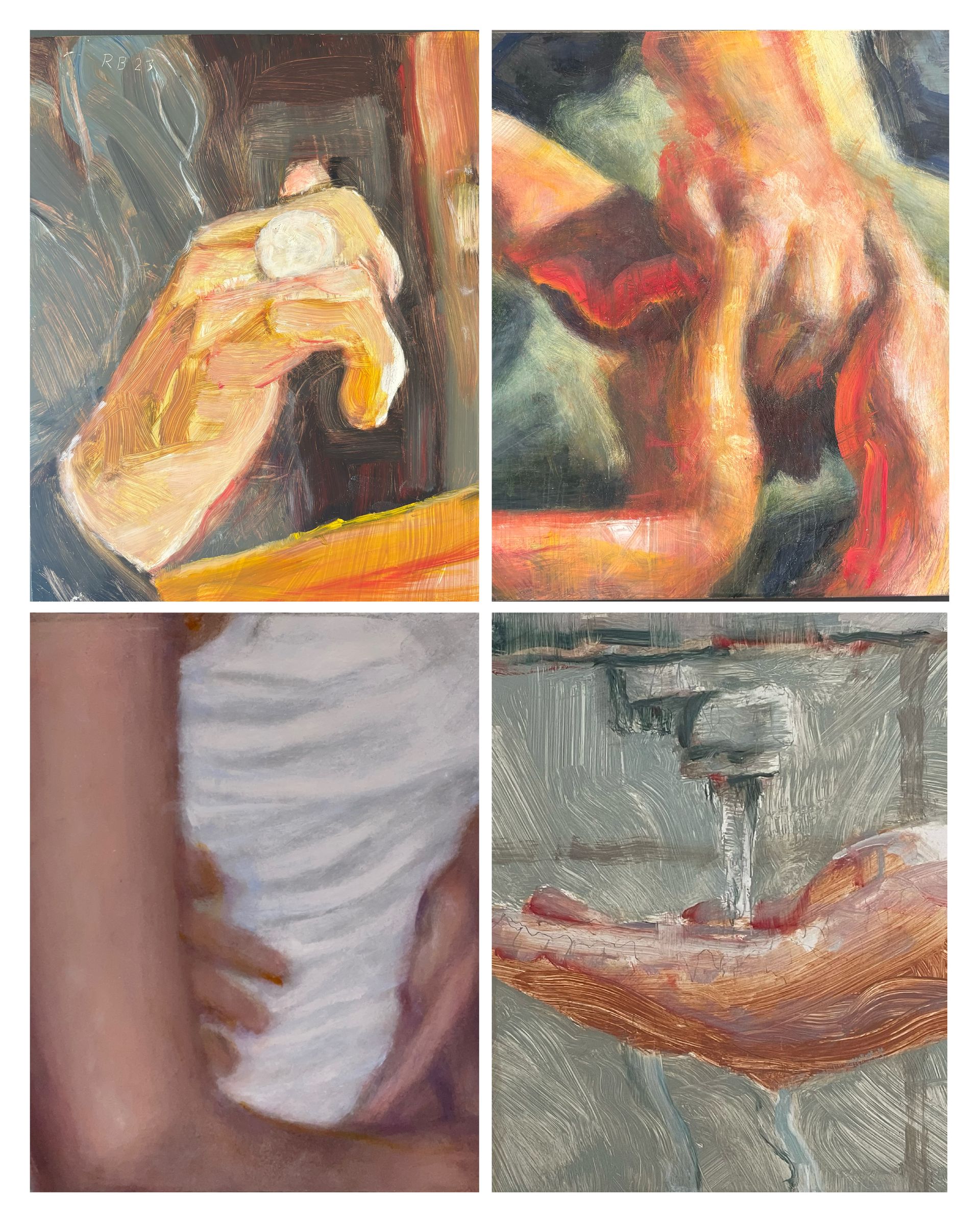 This show features small painting studies focused on hands. Some hands are occupied in different activities, while others are shown in repose. The subjects are described as enigmatic, with a feeling of both peace and something disruptive that cannot be seen.