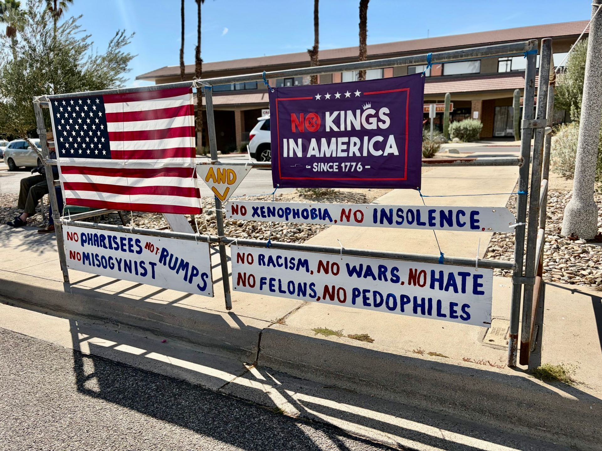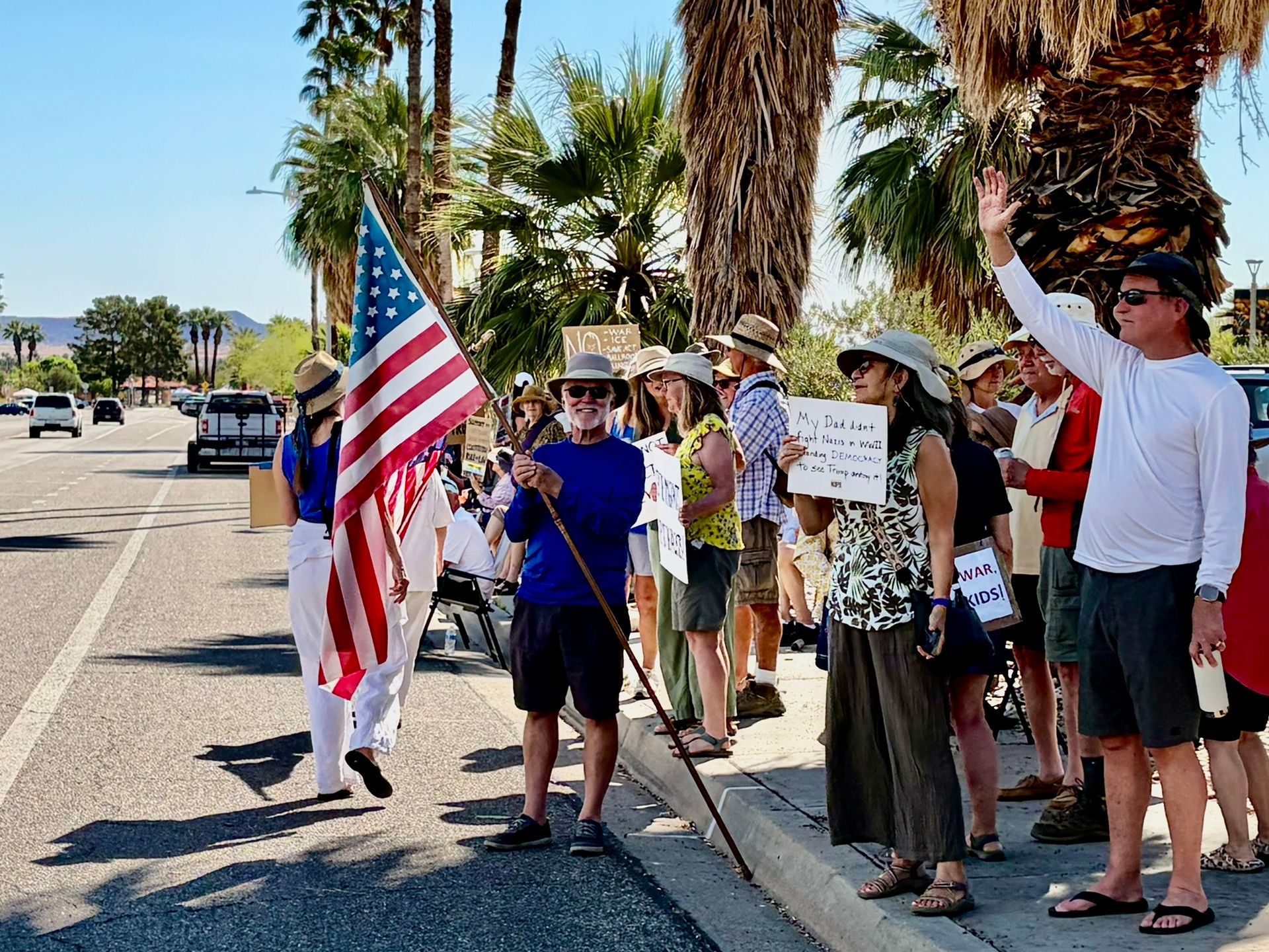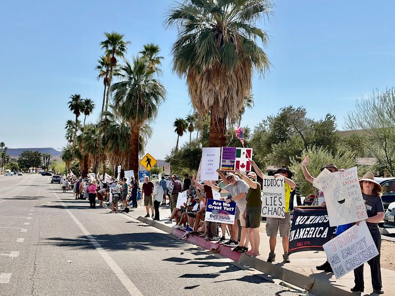 A “No Kings” protest took place Saturday, March 28, with over 100 participants lining Palm Canyon Drive in Borrego Springs as part of a coordinated day of events across San Diego County.