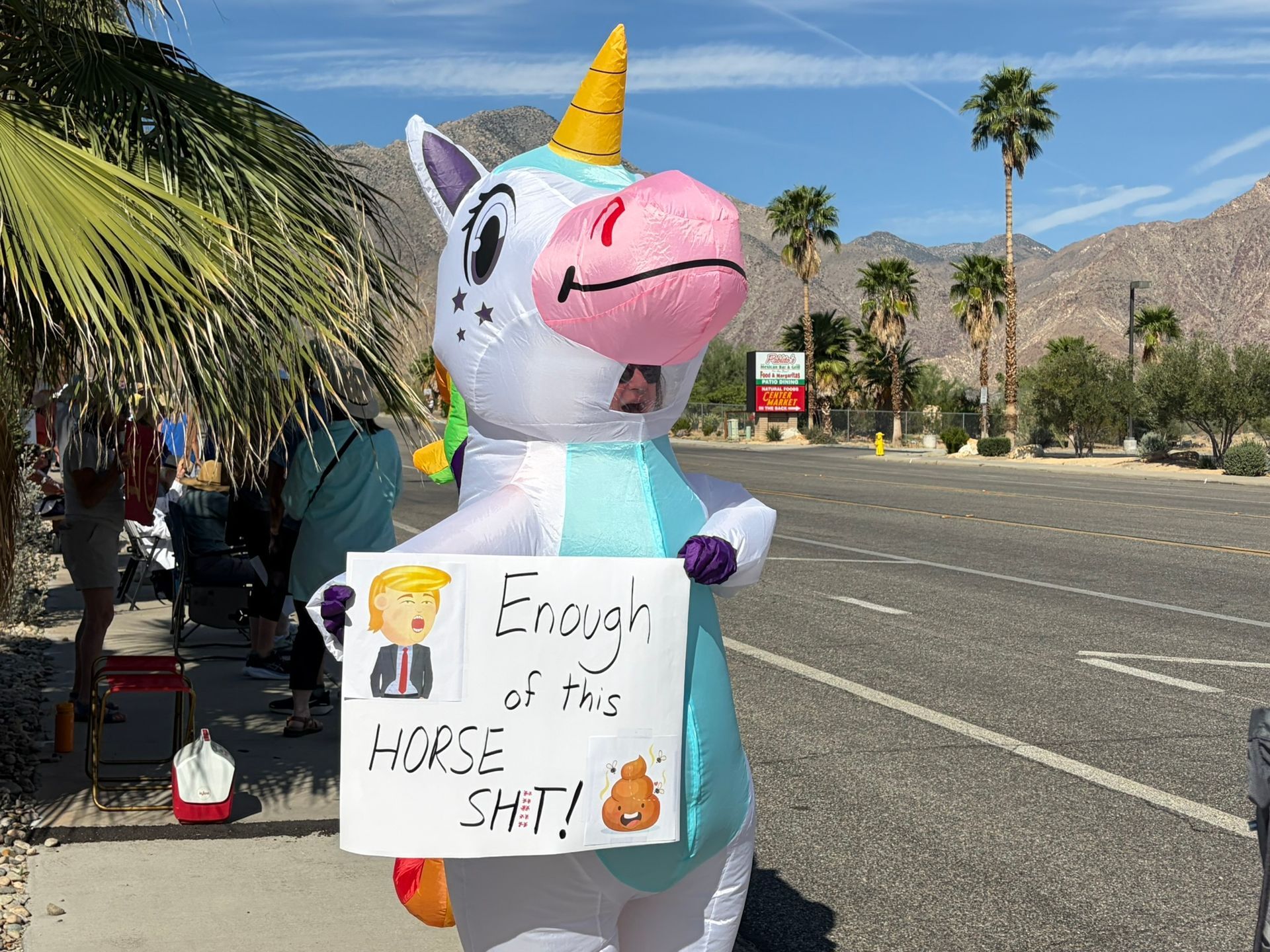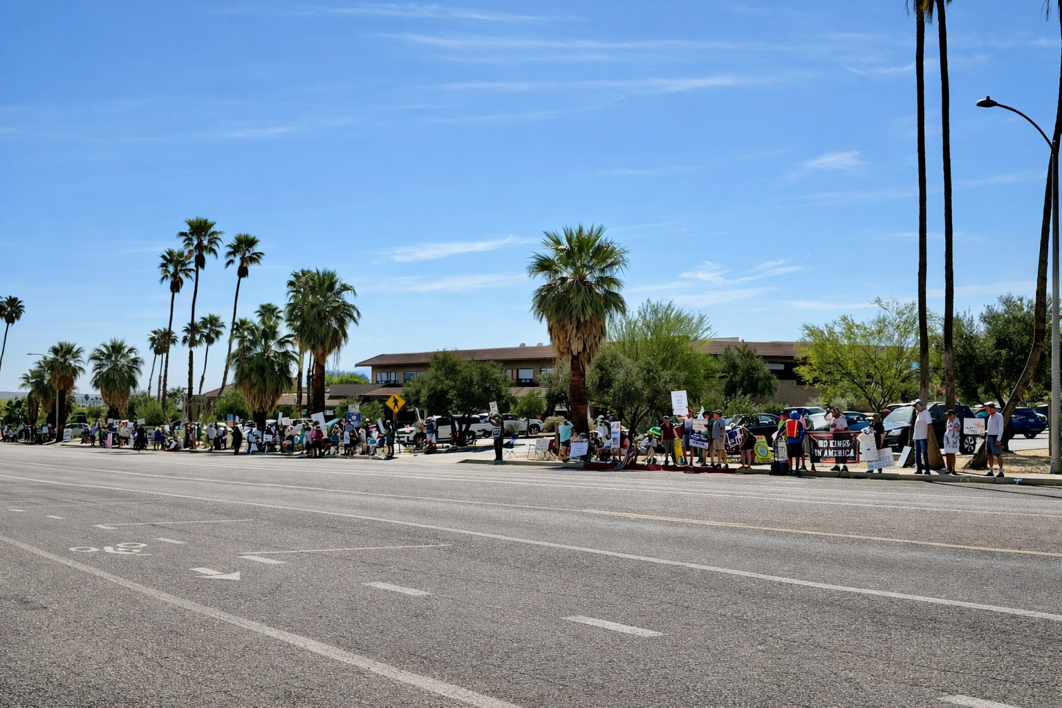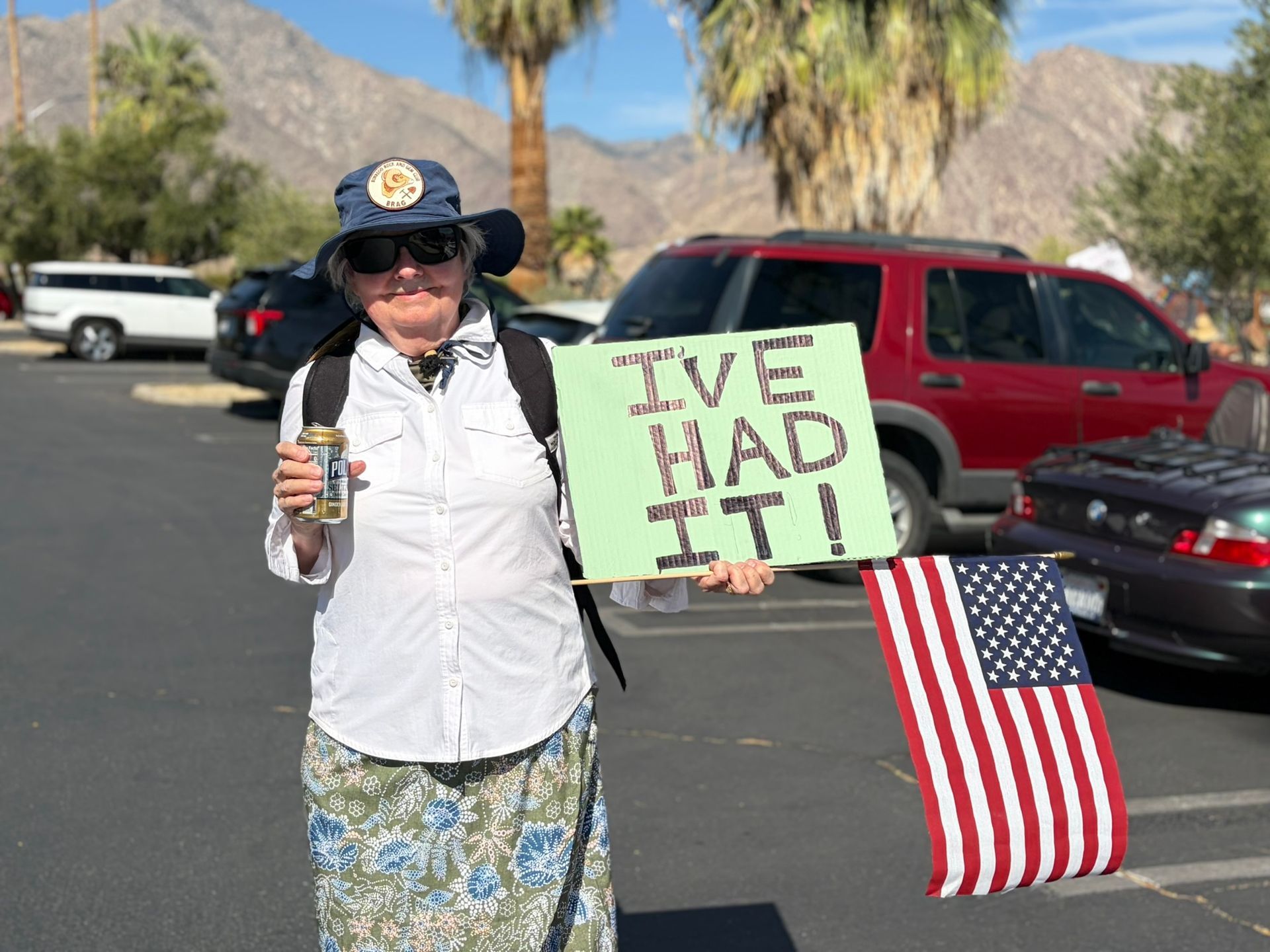 A “No Kings” protest took place Saturday, March 28, with over 100 participants lining Palm Canyon Drive in Borrego Springs as part of a coordinated day of events across San Diego County.