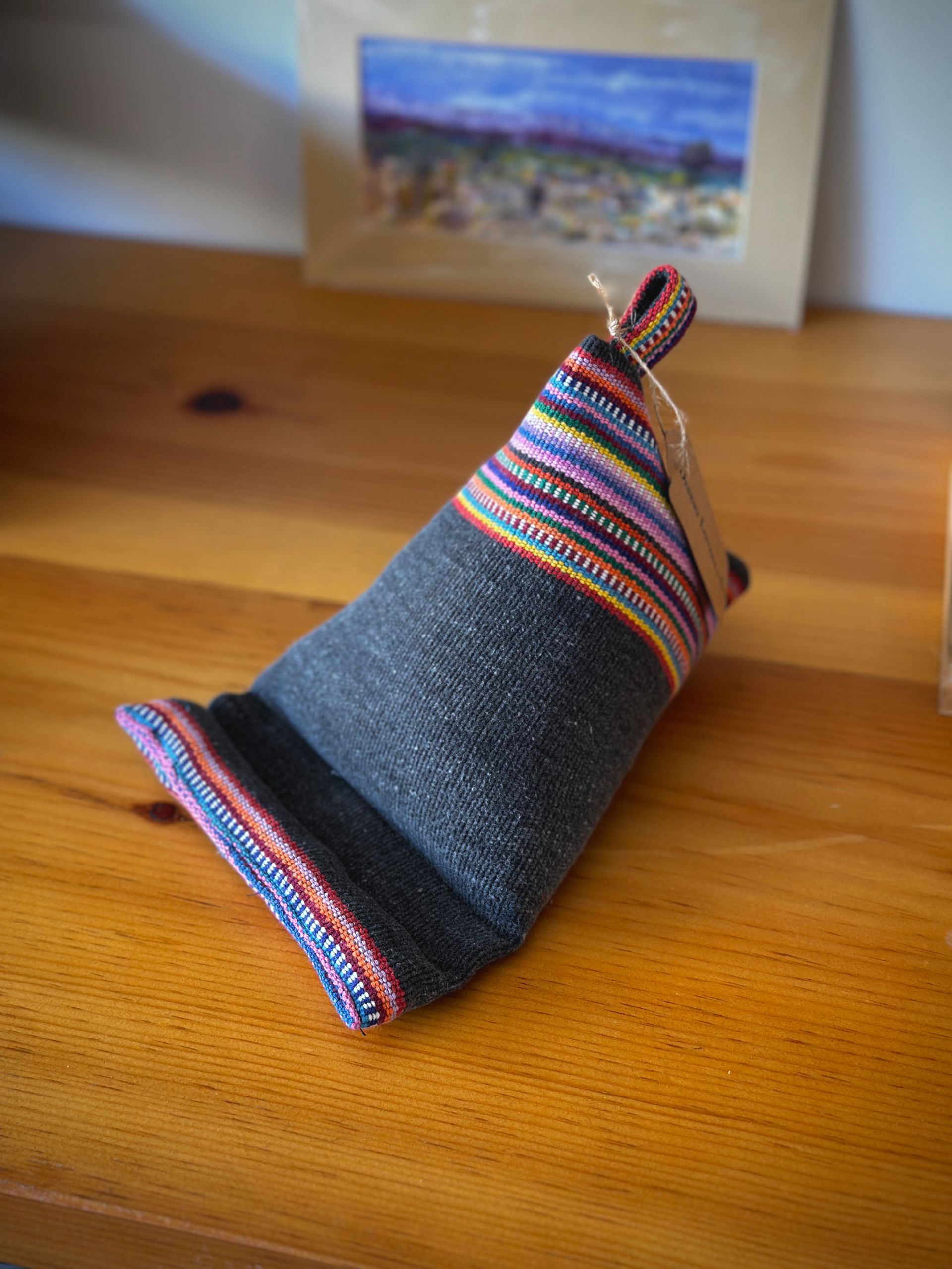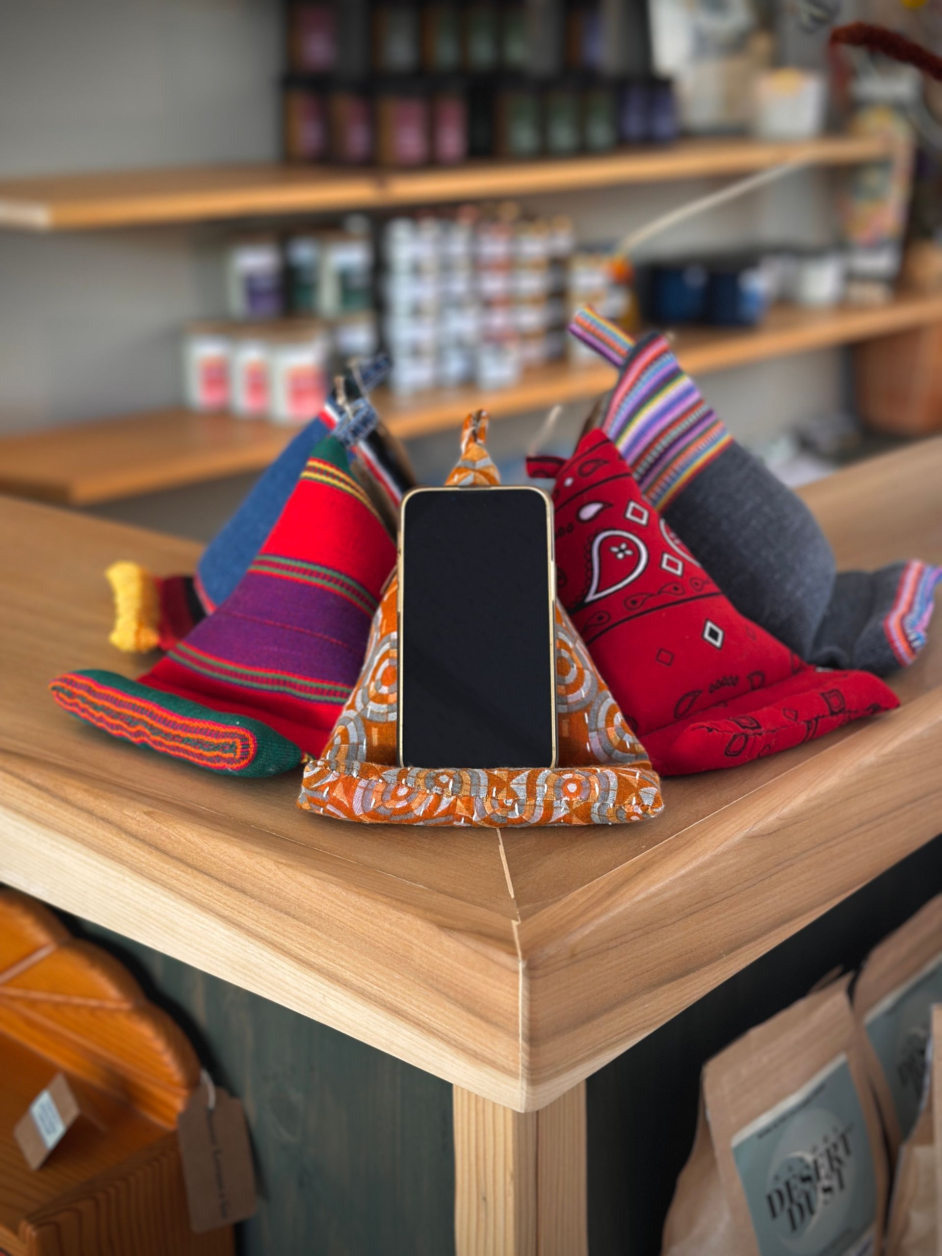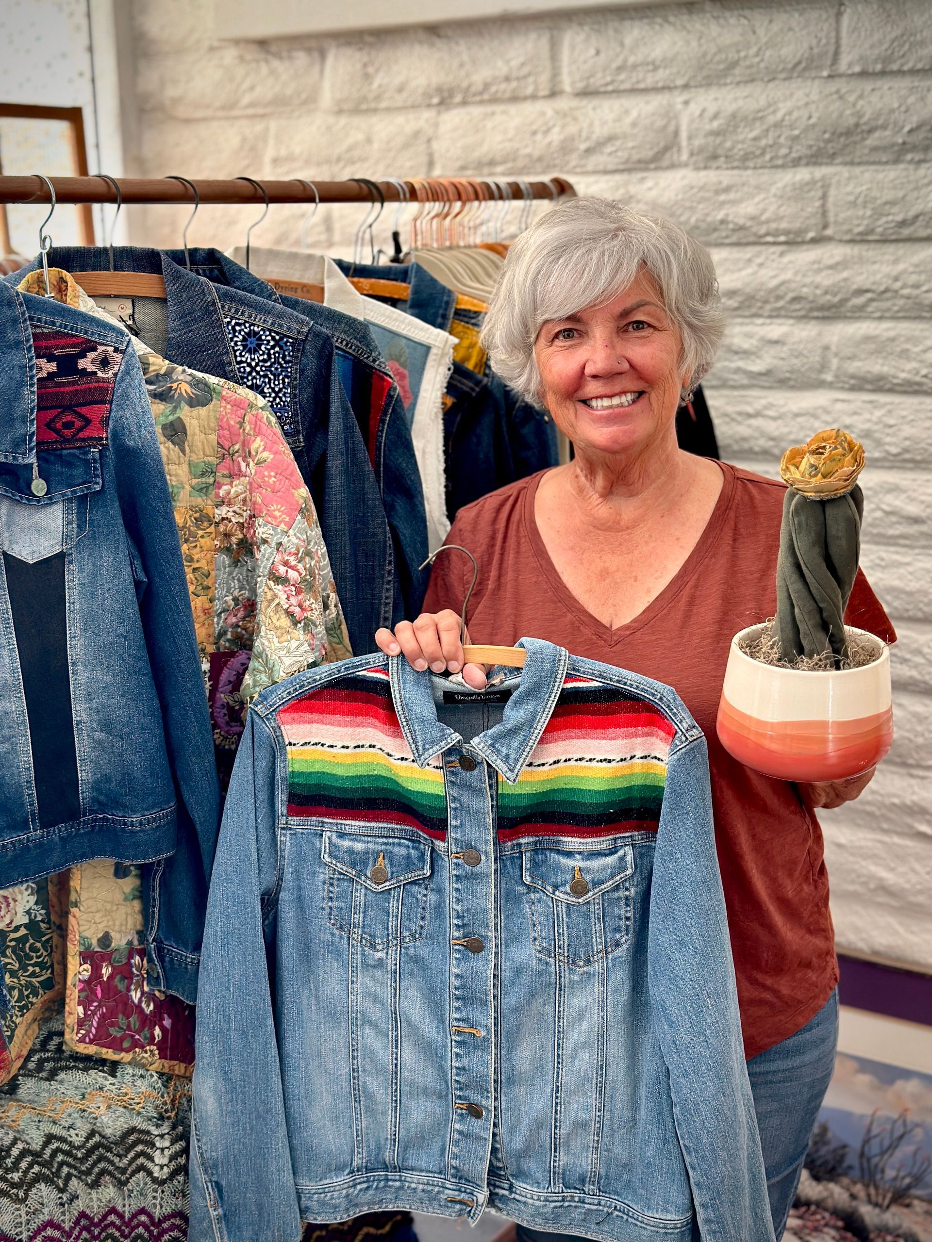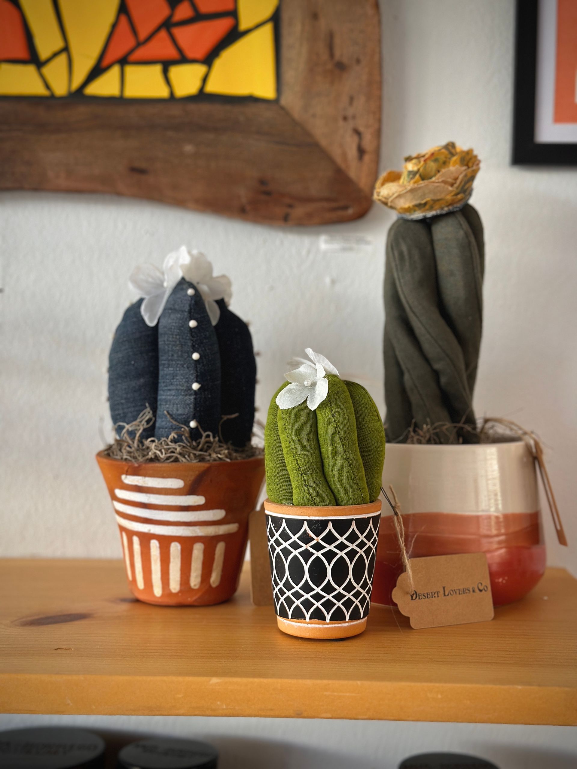 Her work at Desert Lovers & Co includes upcycled and embellished denim jackets, colorful phone and tablet pillows, and her popular fabric cactus sculptures. Each piece reflects her eye for detail and her interest in experimenting with textures, patterns, and new techniques.