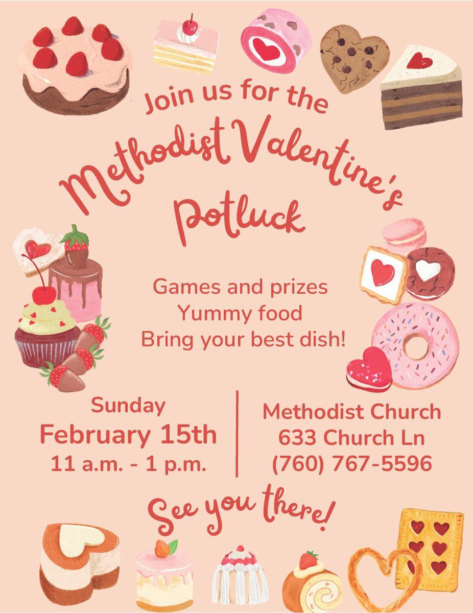 The Methodist Church is hosting a Valentine’s Potluck featuring shared food, games, and prizes. Attendees are invited to bring a favorite dish to share.