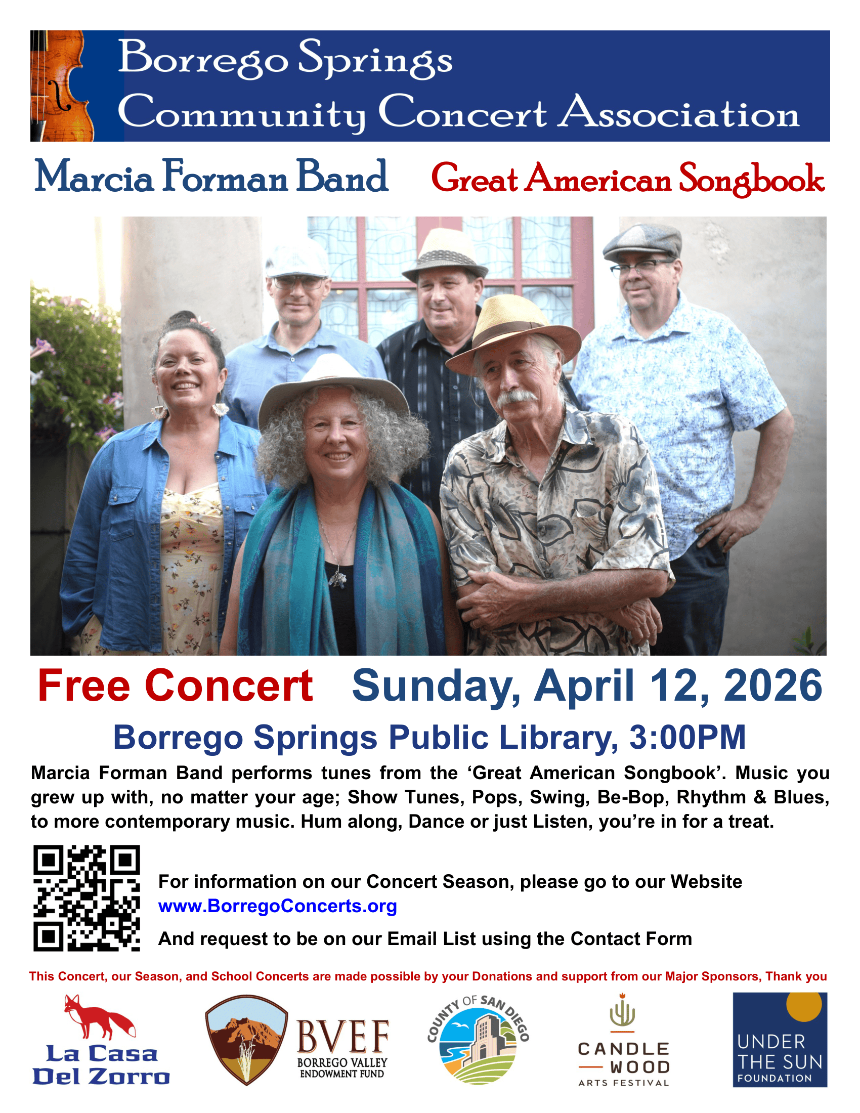 Meta description: Free concert in Borrego Springs featuring the Maria Forman Band performing Great American Songbook music at the public library.