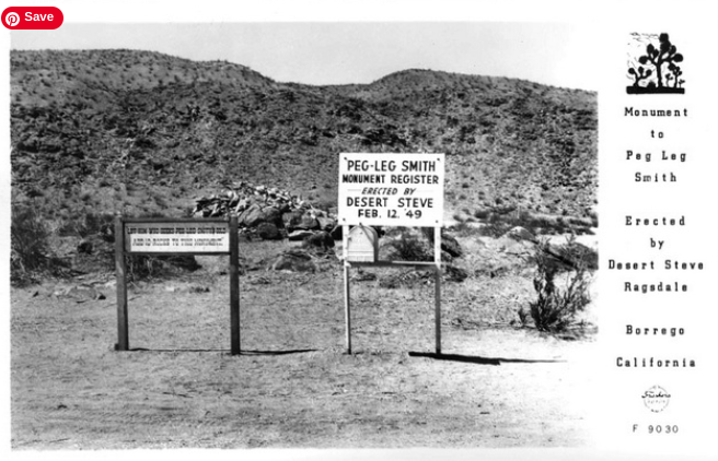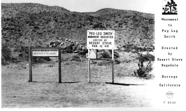 "Thomas L. Smith, better known as 'Peg Leg' Smith, 1801-1866, was a mountain man, prospector, and spinner of tall tales. Legends regarding his lost mine have grown through the years. Countless people have searched the desert looking for its fabulous wealth. The gold mine could be within a few miles of this monument."