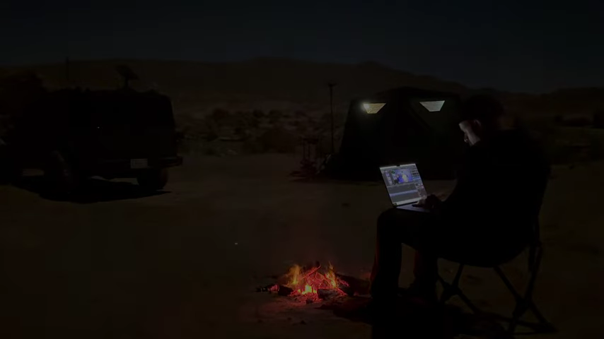 The highlight of the evening is the campfire, an essential element of any camping trip. With the Blackbeard fireplugs and a ferro rod, the Camper brings the fire to life, setting the stage for an evening of editing videos by the firelight. This blend of work and wilderness showcases the ultimate balance between productivity and adventure.