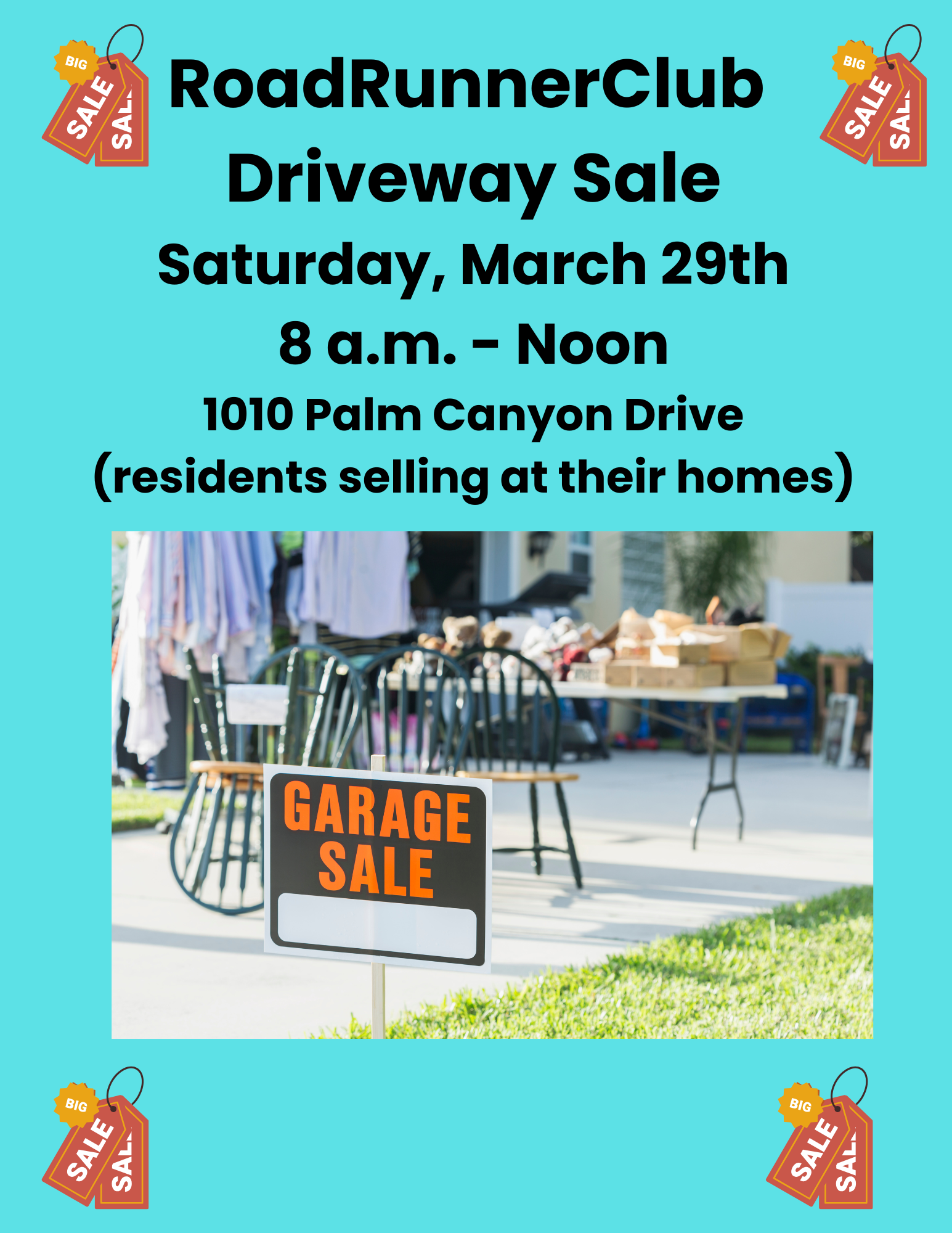 Find great deals at the RoadRunner Club Driveway Sale on Saturday, March 29, from 8 a.m. to noon at 1010 Palm Canyon Drive in Borrego Springs. Residents will be selling items directly from their homes, offering a variety of household goods, furniture, clothing, and more.