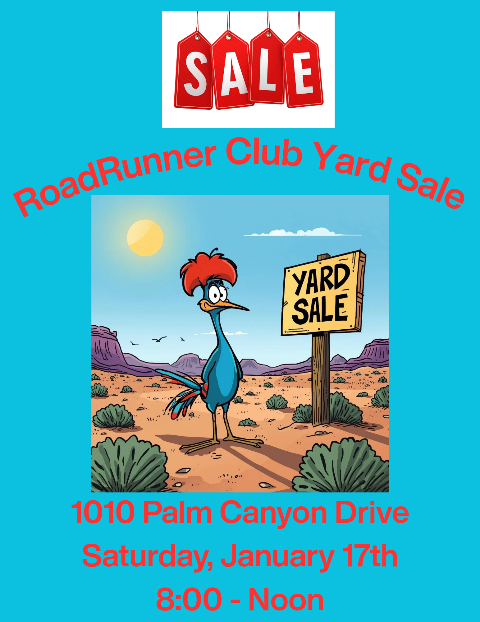 The RoadRunner Club is hosting a community yard sale in Borrego Springs on Saturday, January 17, from 8:00 a.m. to Noon. The sale will take place at 1010 Palm Canyon Drive.