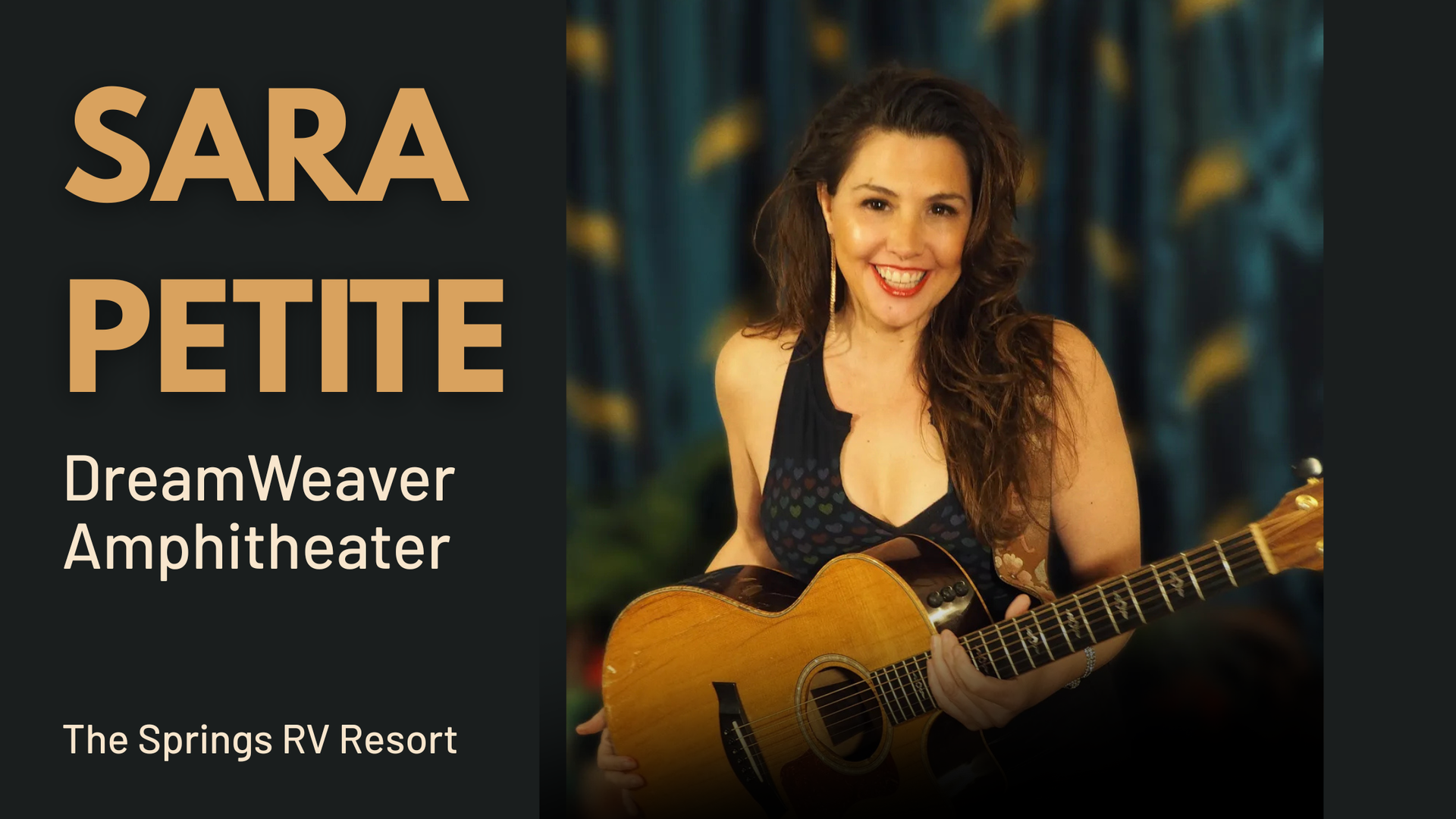 Get ready for an unforgettable afternoon of music at The Springs RV Resort. Sara Petite, a fiery Americana singer-songwriter from San Diego, takes the stage at the DreamWeaver Amphitheater on Saturday, November 29, 2025, at 3:00 PM.