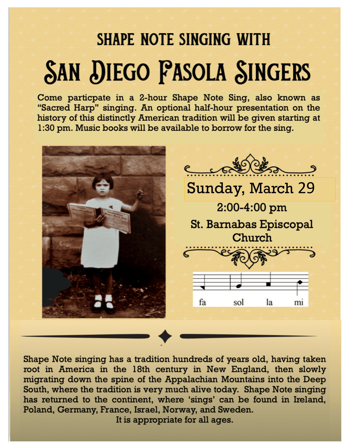 On Sunday, March 29th, the San Diego Fasola Singers will lead a free two-hour sing at St. Barnabas Episcopal Church, with an optional half-hour history presentation beforehand. This gathering offers a chance to learn, listen, or join in, with loaner music books available. Below is a closer look at the history and what to expect.