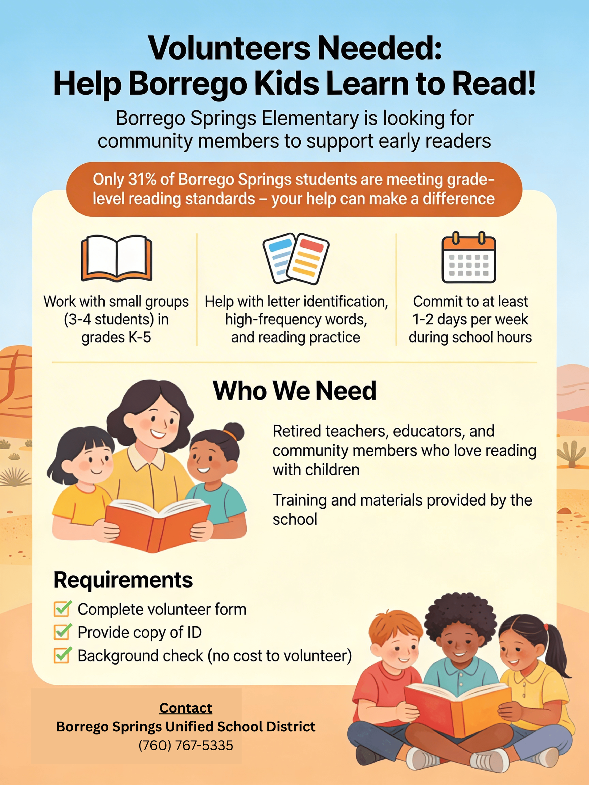 Currently, only 31% of Borrego Springs students are meeting grade-level reading standards. The school is working to close that gap and is inviting volunteers to be part of the solution.