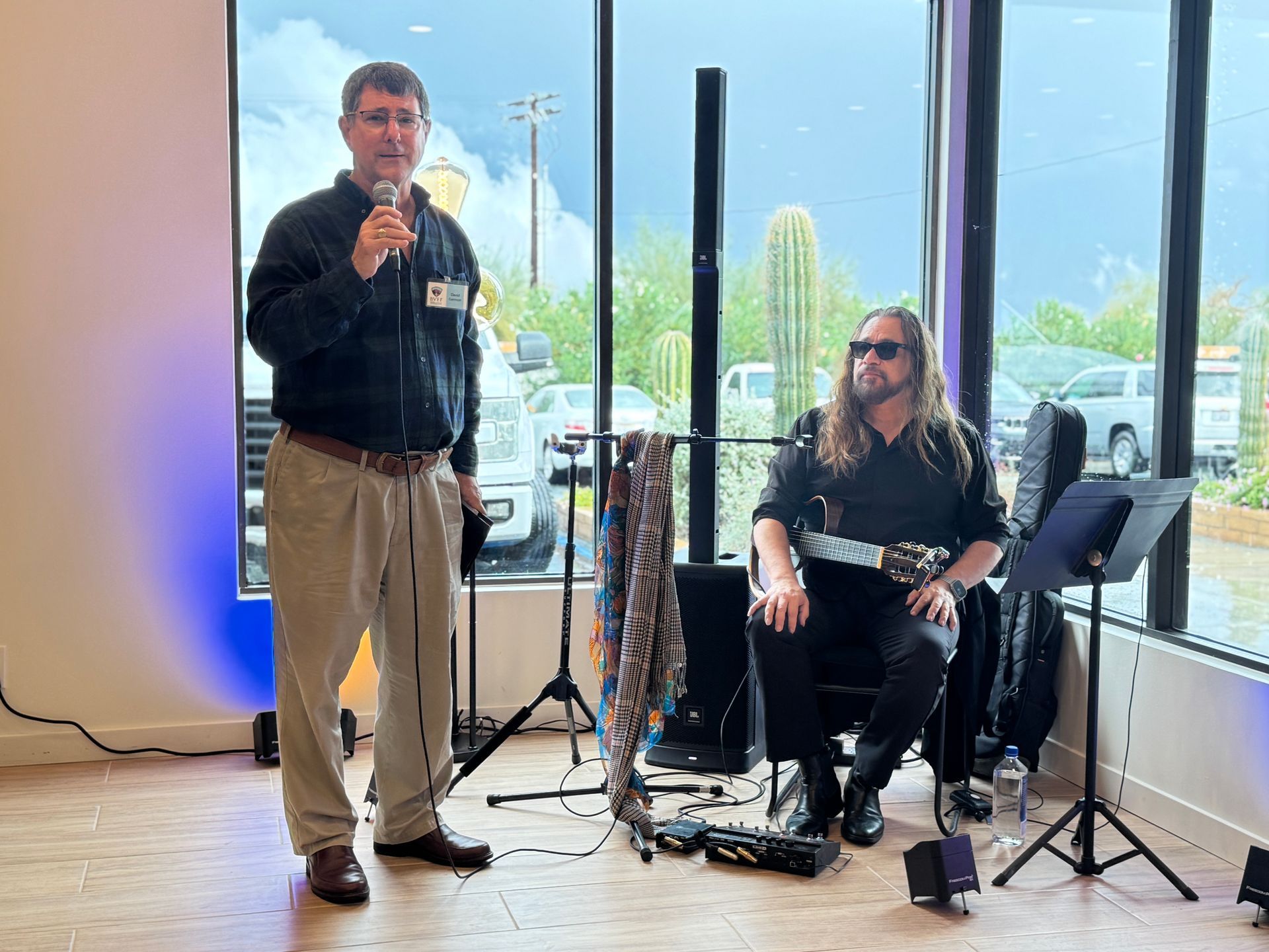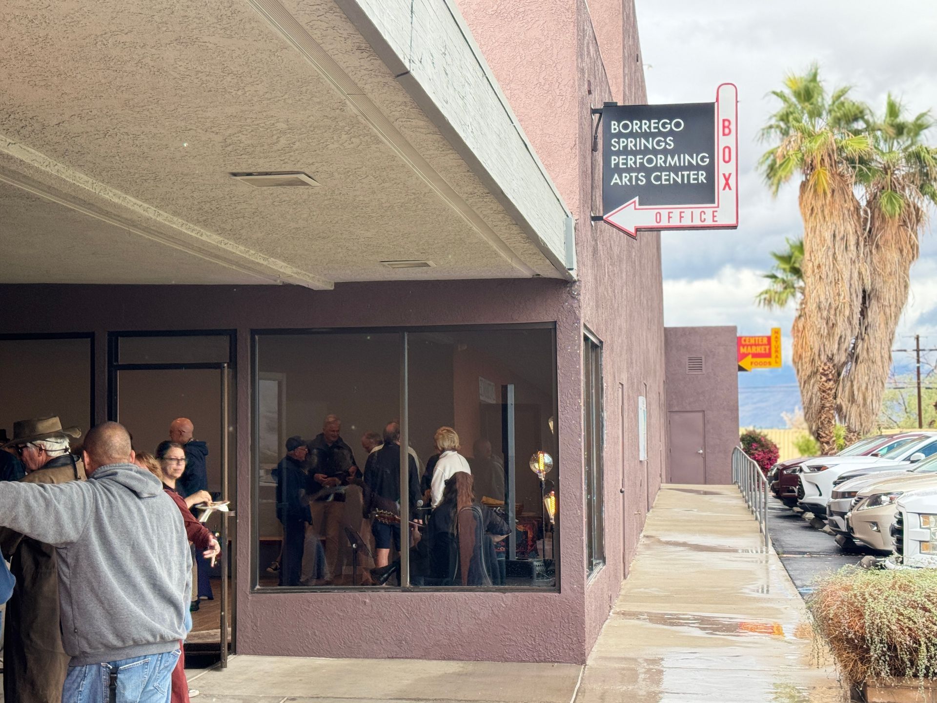 A brief break in the rain allowed attendees to gather inside the Borrego Springs Performing Arts Center (BSPAC) lobby and outside along the covered walkway. Despite the weather, the turnout was strong, underscoring the importance of this moment for Borrego Springs.