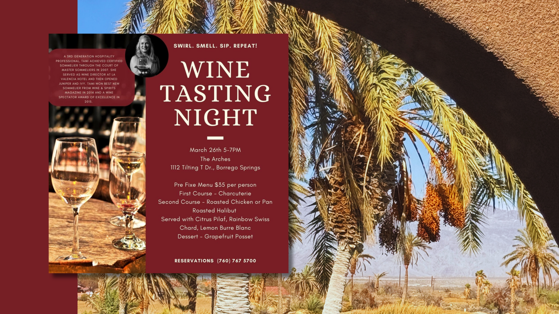 Wine enthusiasts and food lovers, mark your calendars! Borrego Springs is hosting a special Wine Tasting Night at The Arches restaurant on March 26th from 5-7 PM.